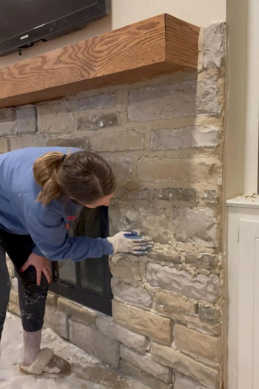 Once all the stones were securely in place, I allowed them a day to set and dry. Following this, I began the process of filling in the grooves. Using a mortar bag—similar to icing a cake—I carefully squeezed the mortar into all the gaps between the stones and around the mantle.
