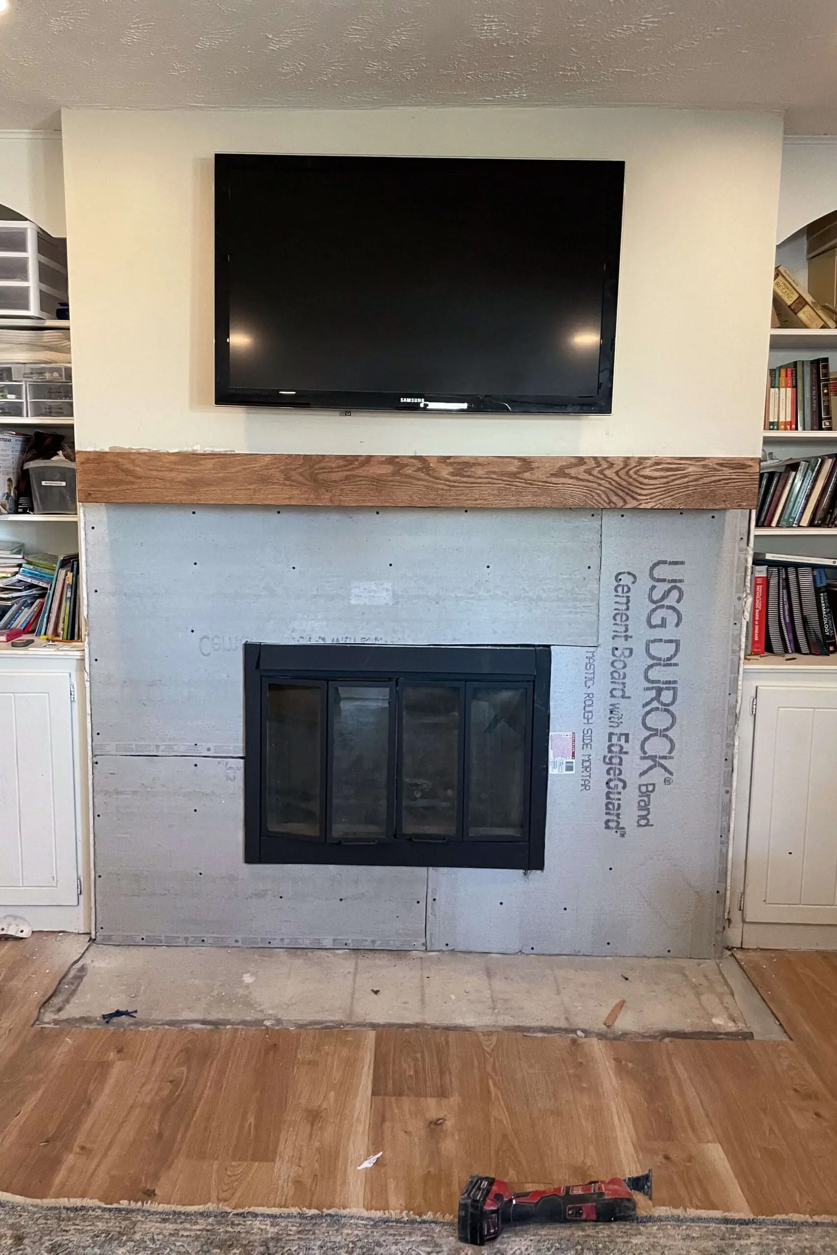 With the mantel in place, I prepared to install new stone. I first installed a non-combustible cement board as a backing for the stones. Using an angle grinder with a masonry blade, I made the necessary cuts to fit the cement board around the mantel and insert.