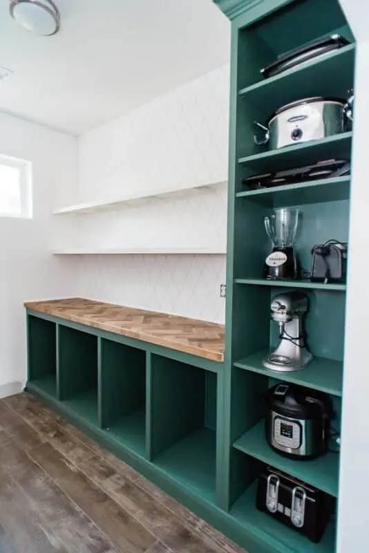 When the 19th century household first introduced the concept of a Butler’s Pantry, it functioned as a place to store china and hide waitstaff. Now it’s a place to store canned peas and hide air fryers. This design is attractive enough to be built out in the open, and the measurements can be adjusted to fit any size room. I didn’t have the right type of area to build a butler’s pantry, but my sister-in-law did, and it made her imaginary butler so happy to have a beautiful place to store the plastic forks.