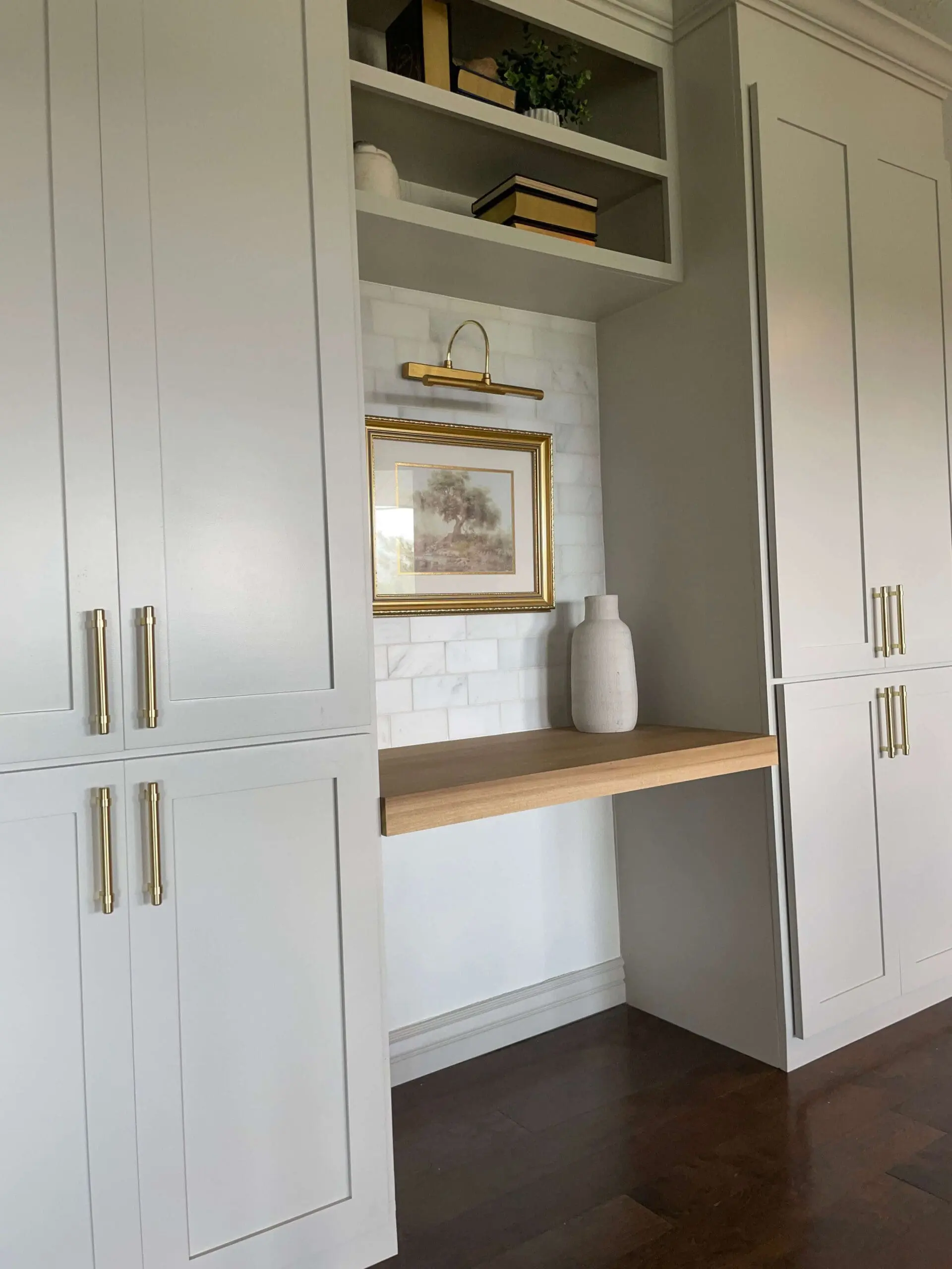 To elevate the look of my built-ins, I added a tile backsplash using Riad Tile’s Honed 3×6 Subway Casablanca Carrara Marble. The white and gray tones paired beautifully with my Sherwin Williams Gossamer Veil cabinets.