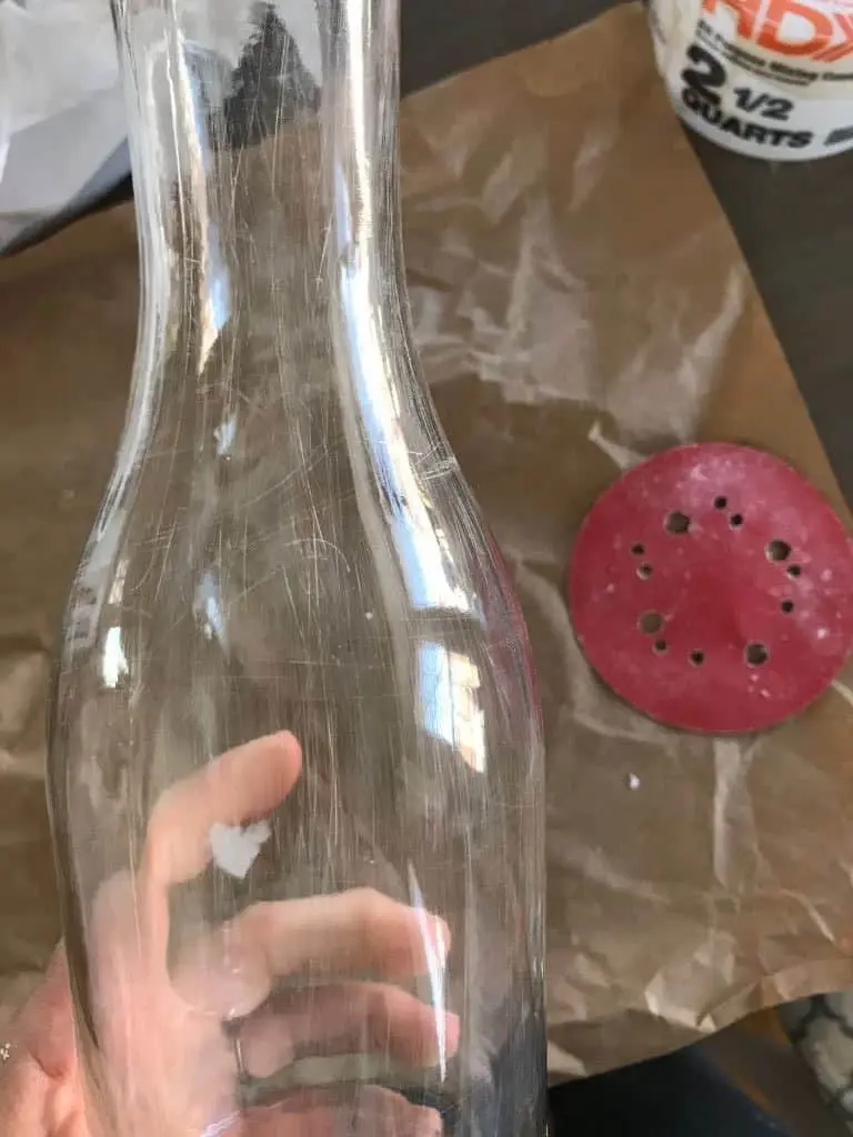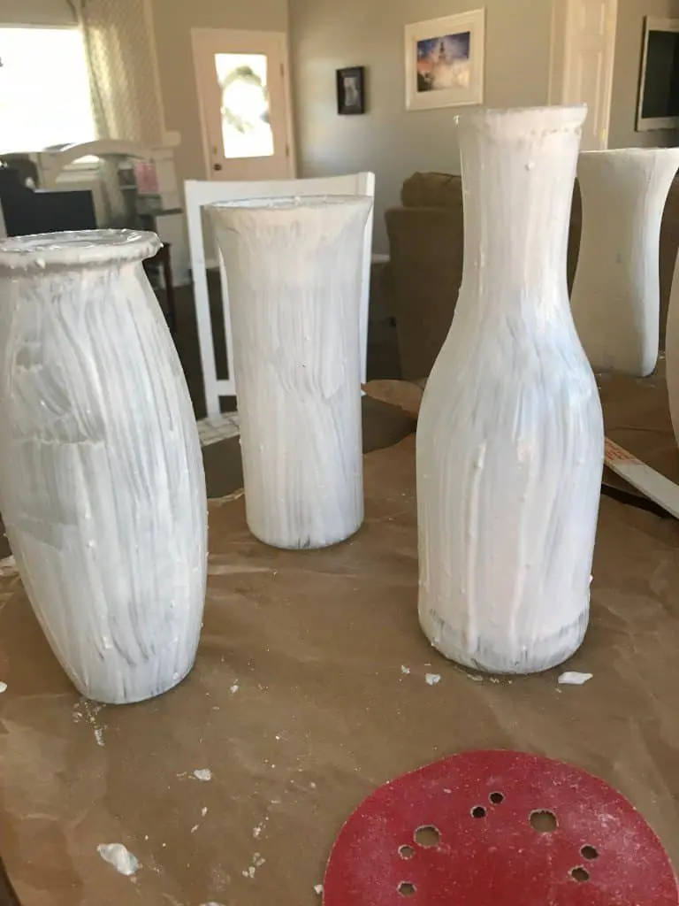 Here’s what I started out with. I went to my local thrift store and found some old vases that had a shape I liked. I found several different shapes, matched the height as well as I could, and brought them home. I began by roughing up the glass with the sandpaper to help the plaster stick just a little bit better.