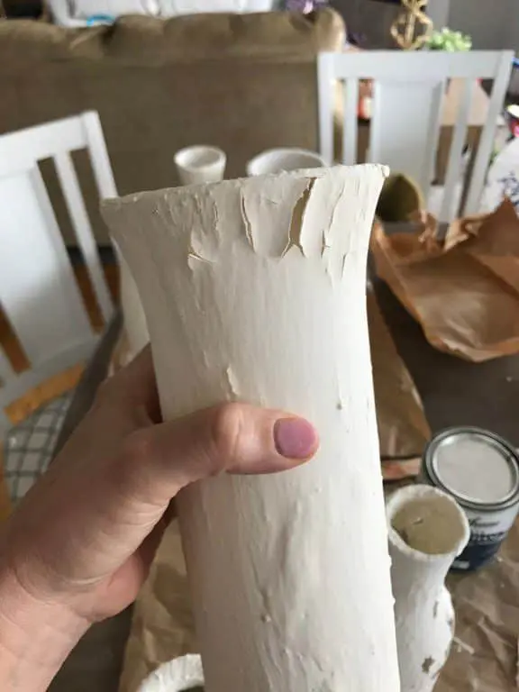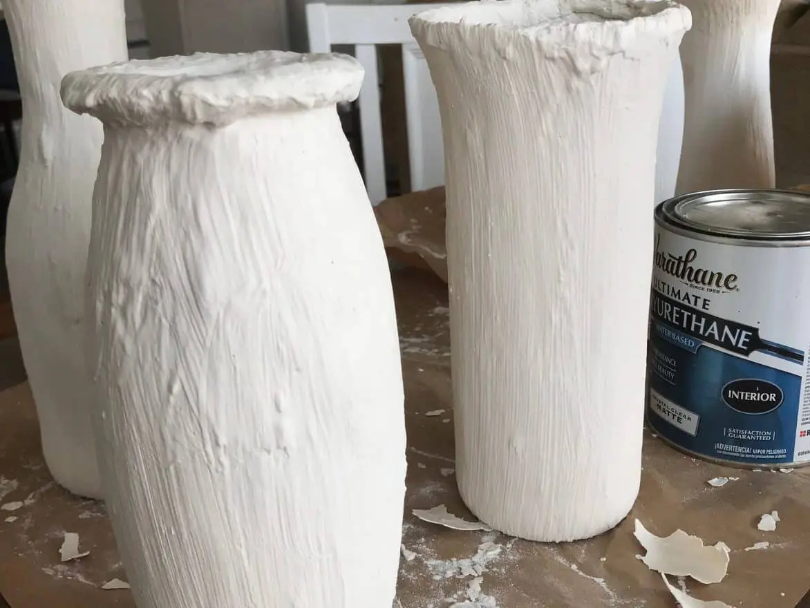 At this point your vases will be very dusty. After blowing off the dust as well as possible, I layered on a coat of the polyurethane to protect the vases from chipping.