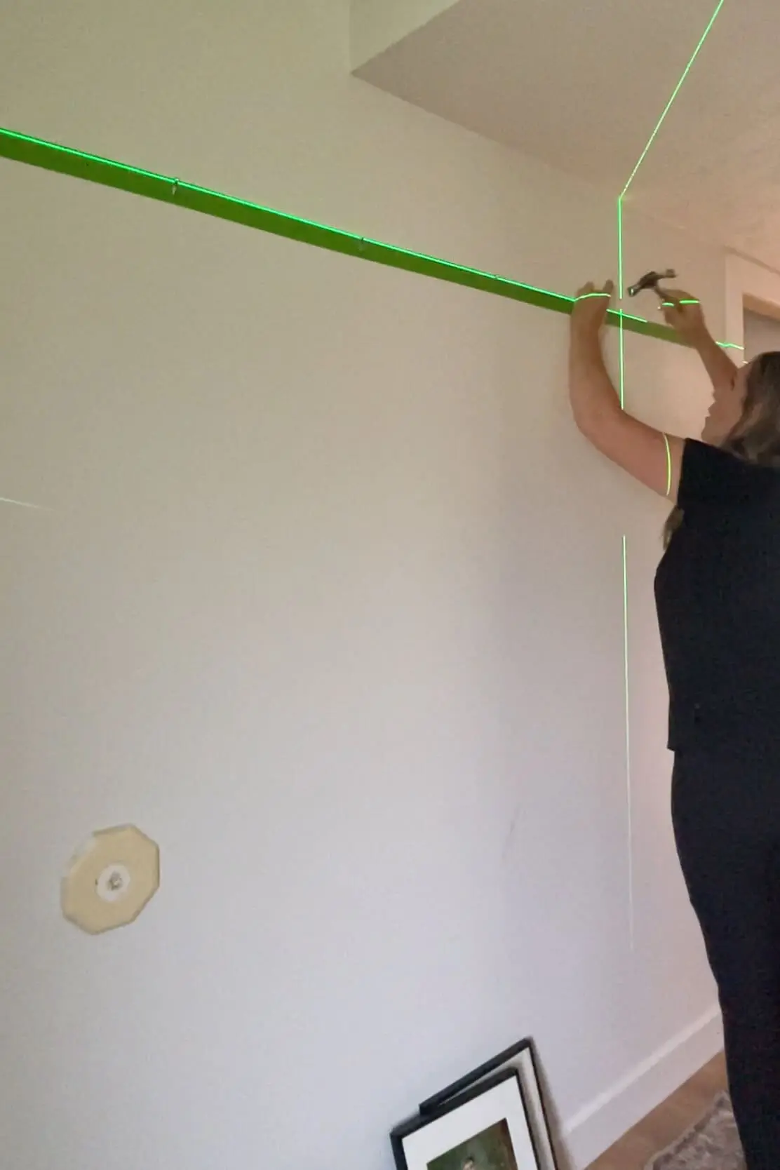 Using a tape measure, I found the center where I wanted my gallery wall layout to start, marked it on the painter’s tape, and hammered in a nail right on the laser level line.