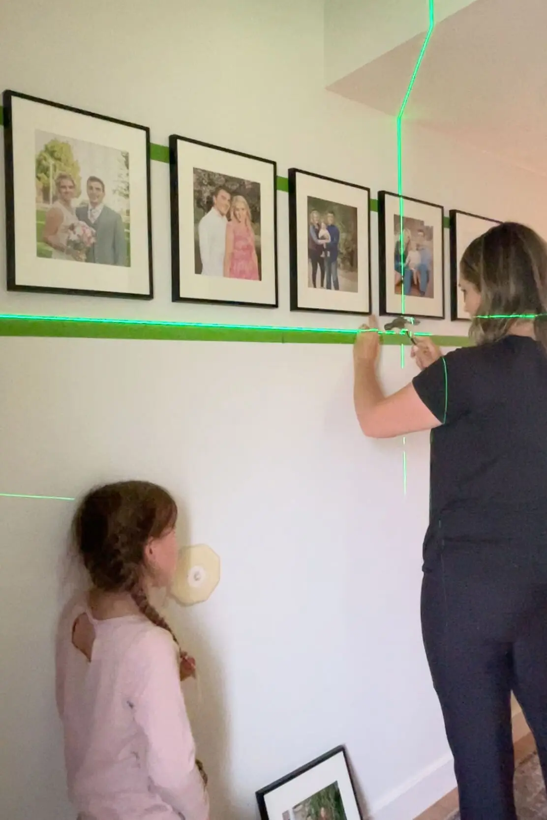 For my gallery wall layout, I’m doing two rows of family pictures. I started by setting up my laser level to give me a straight line for the top row of pictures. Then, I added a row of painter’s tape along that laser line. The tape lets me make marks without ruining my walls.