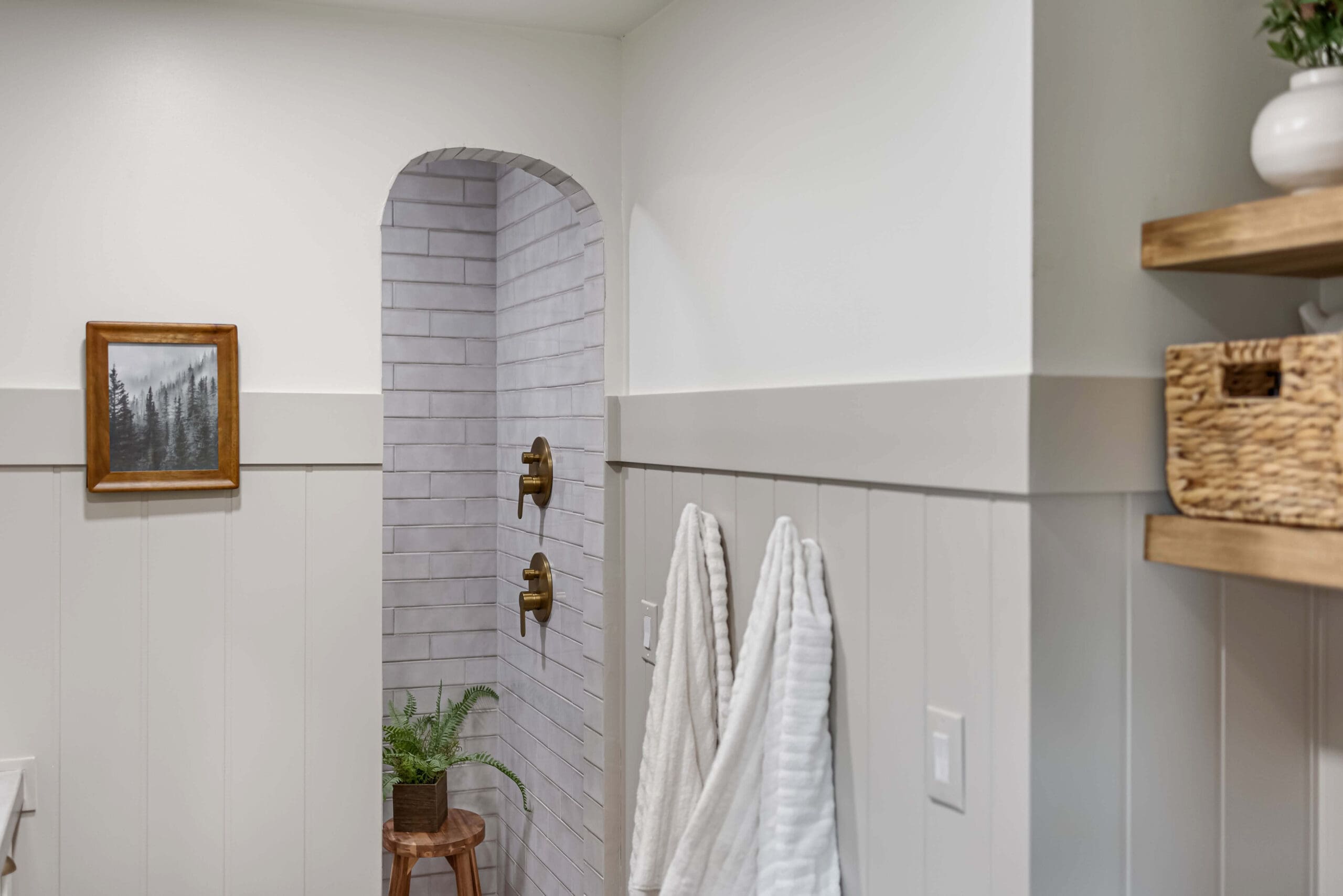 Can we talk about how good these vertical shiplap walls turned out? I’m so glad I went with Sherwin Williams Accessible Beige – one of my go-to neutral paint colors. It’s warm, inviting, and just the right tone.
