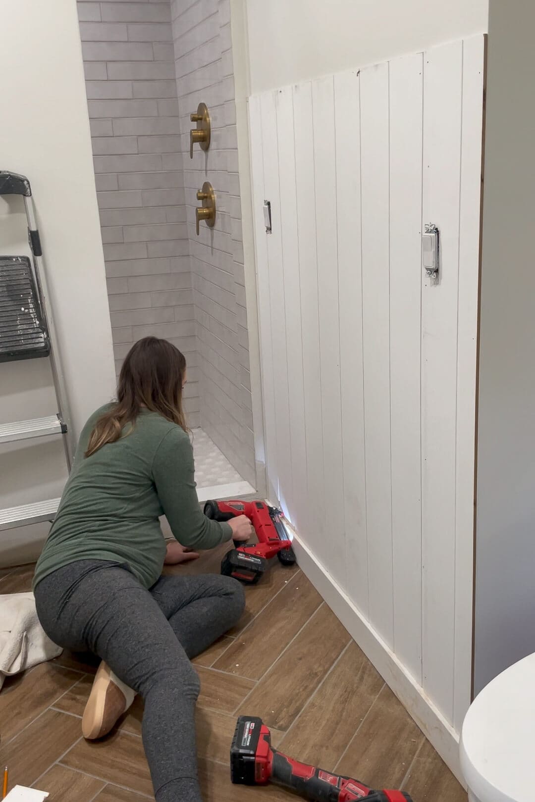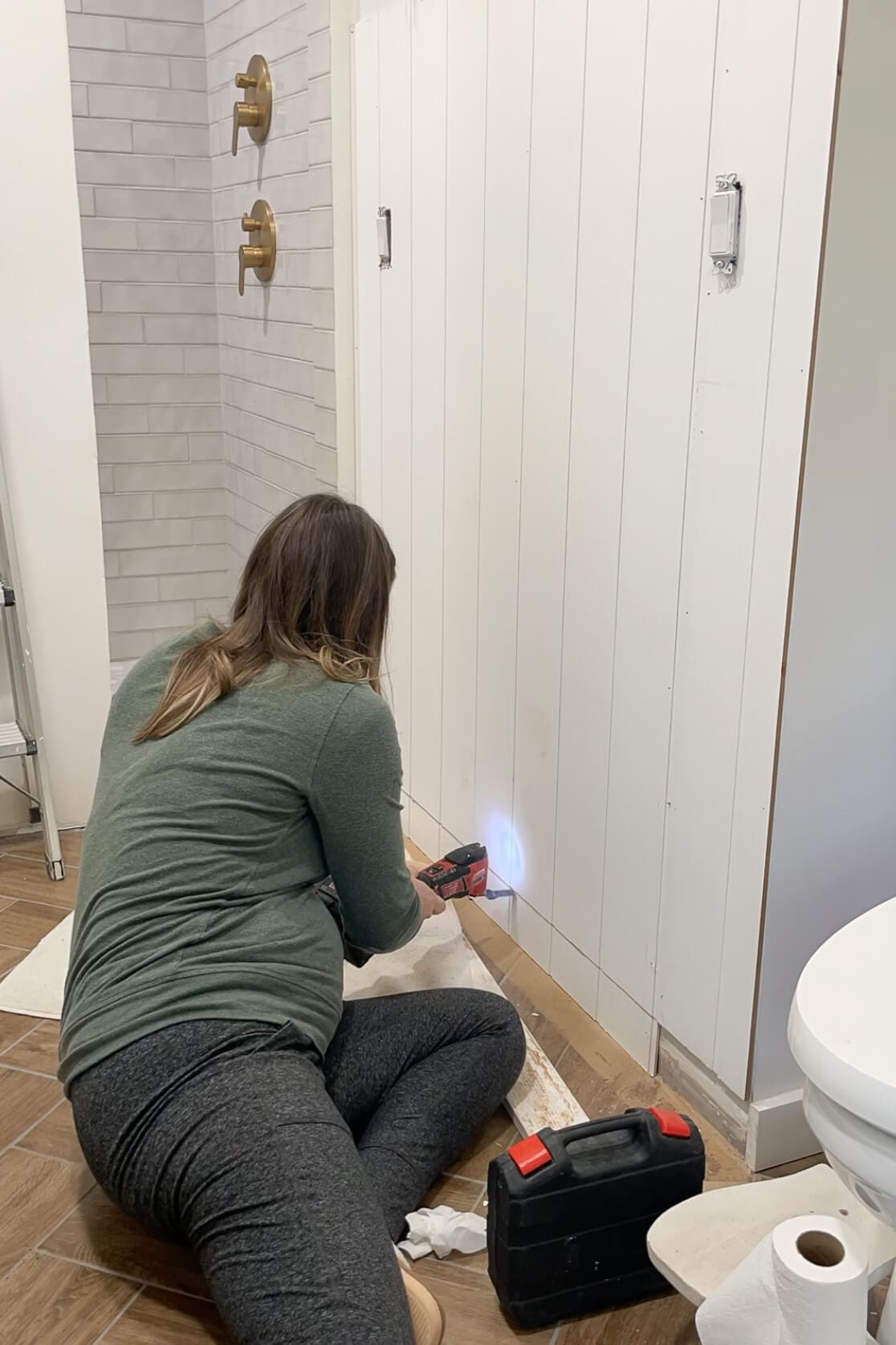 After installing my first panel of vertical shiplap walls, I decided I wanted my baseboard to sit below the shiplap rather than in front. So, I used my multi-tool to trim the bottom of the panels where needed.