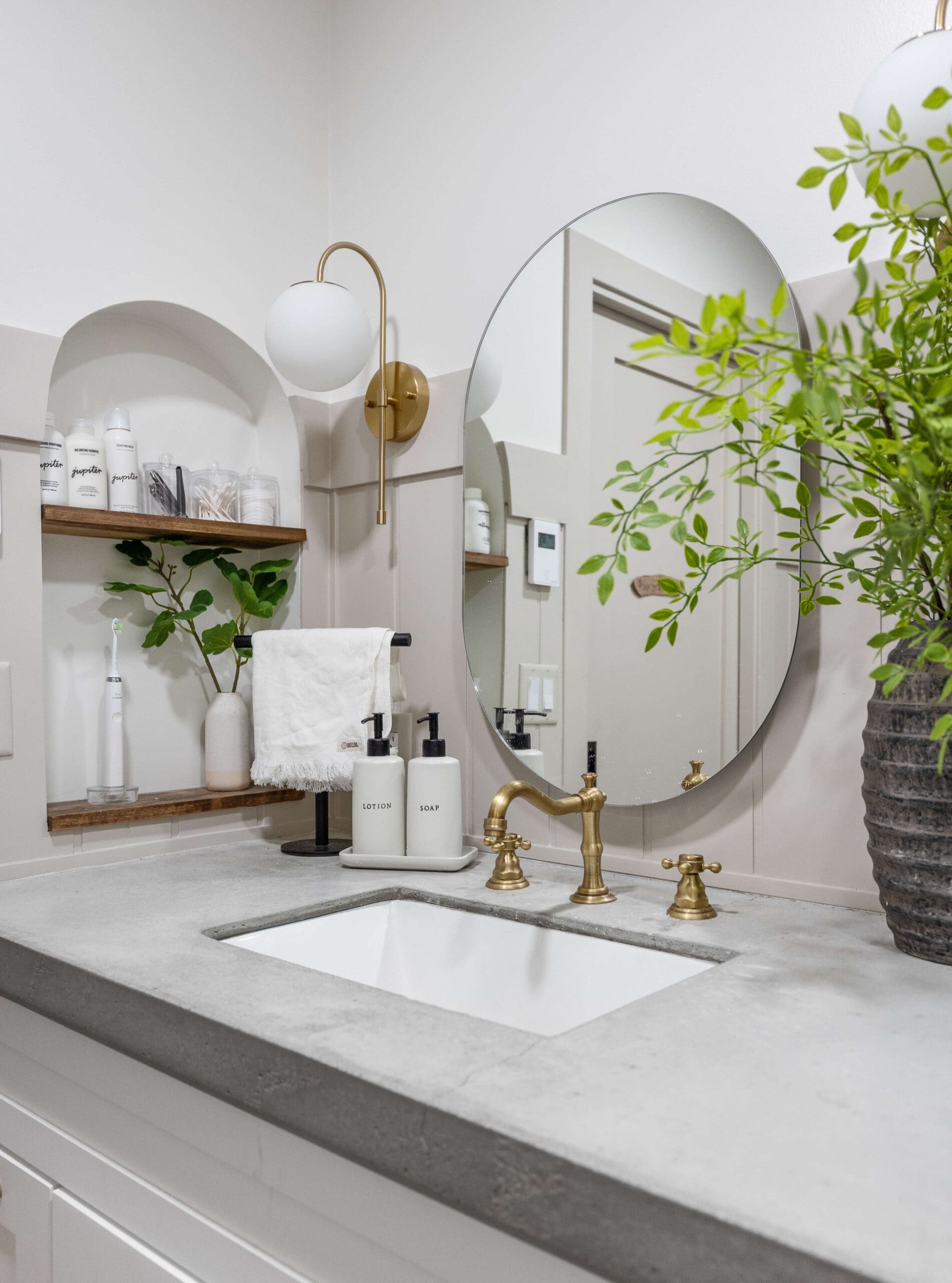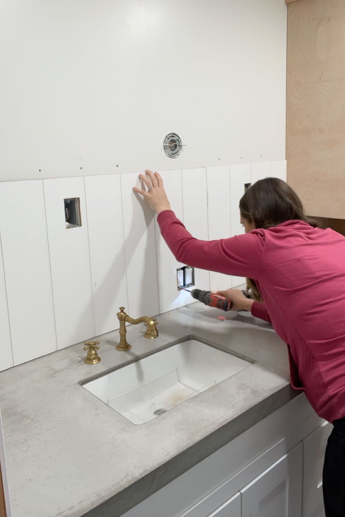 The vertical shiplap walls even made the perfect backsplash behind my mirrors. Where it meets my DIY concrete countertops, I added a small piece of PVC trim and sealed everything with silicone for a clean, finished look.