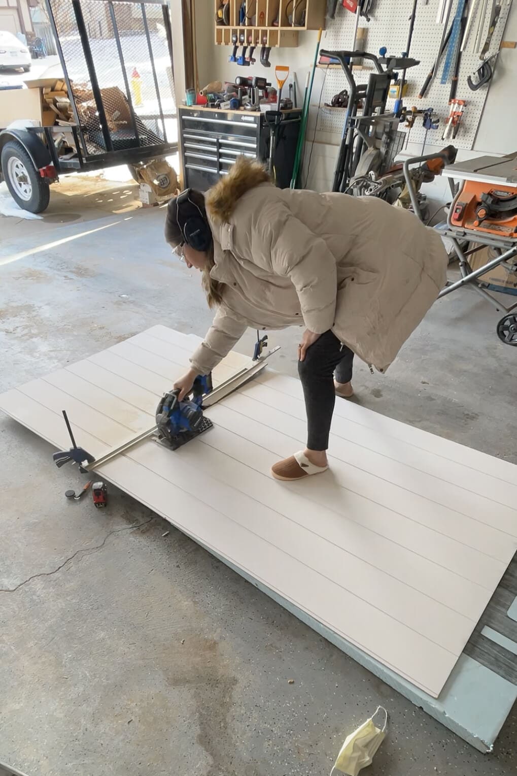 Since the panels were taller than I needed, I had to trim them down. Wrestling a big, floppy sheet of wood through a table saw alone? Not happening. Instead, I used a circular saw with a straight edge as a guide for clean cuts. For outlet and light switch cutouts, my multi-tool was a lifesaver.
