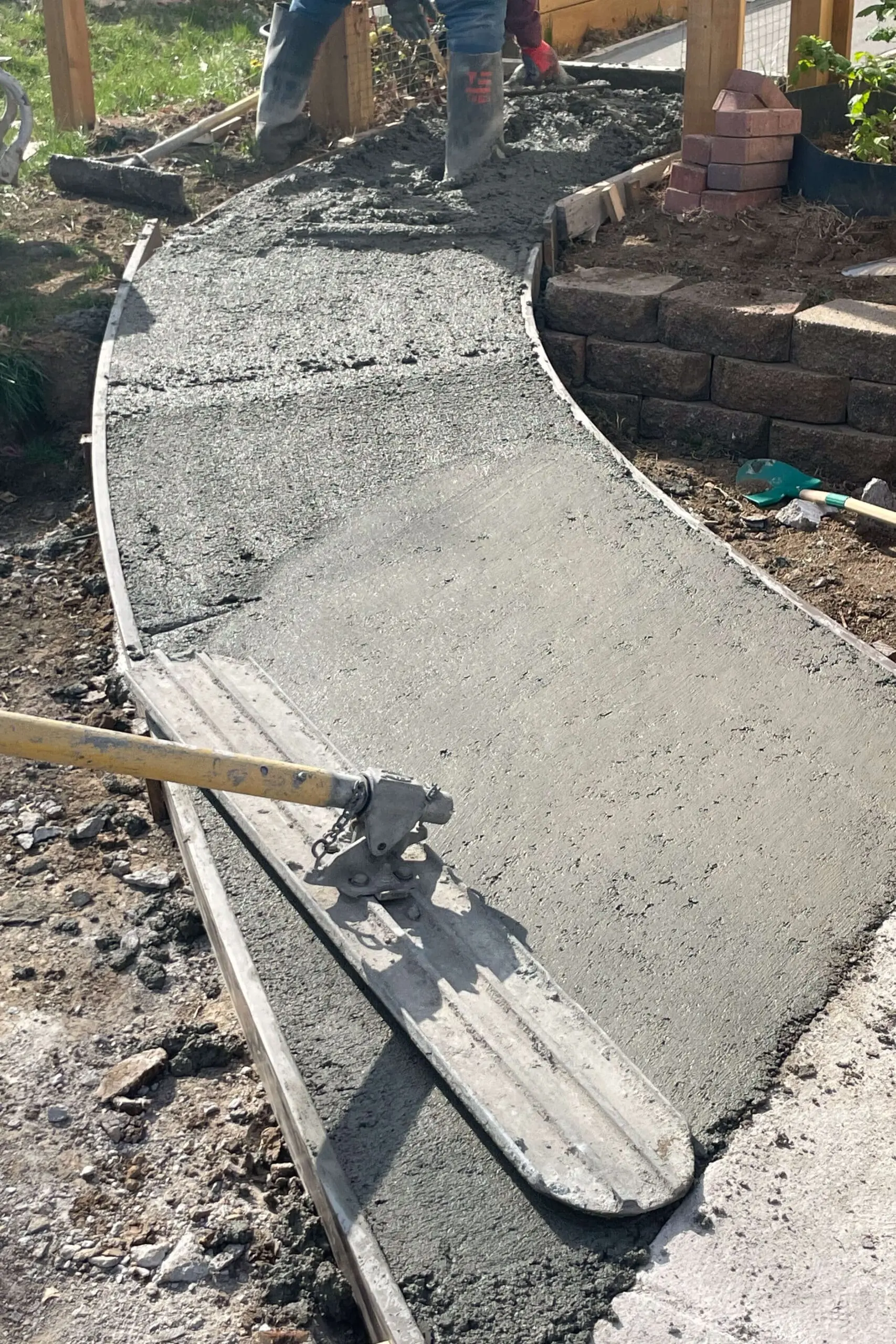 A concrete rake (lower part of the picture) is used to pull the concrete back and move it around inside the forms, making sure they’re completely full. A concrete float (upper part of the picture) is used to give the concrete a nice smooth finish.