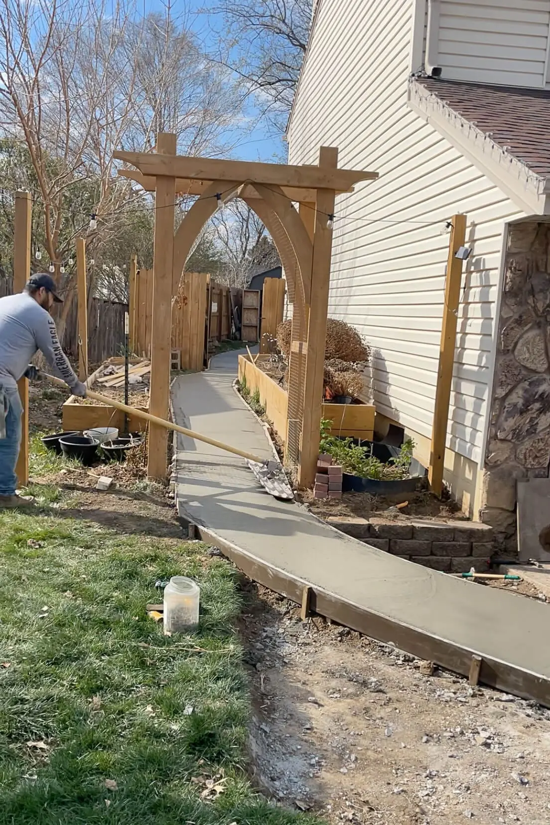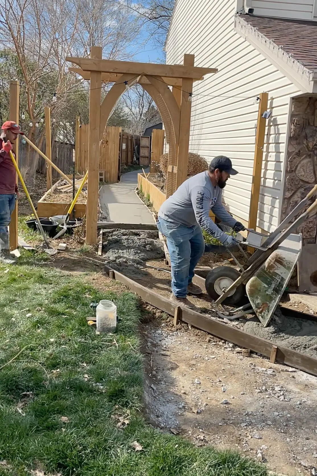 One wheelbarrow full at a time the concrete gets moved from the truck to be dumped inside the forms. They’re dumping it right on top of these pieces of tension rods they added to give our concrete sidewalk some rigidity and help it hold together better over time.