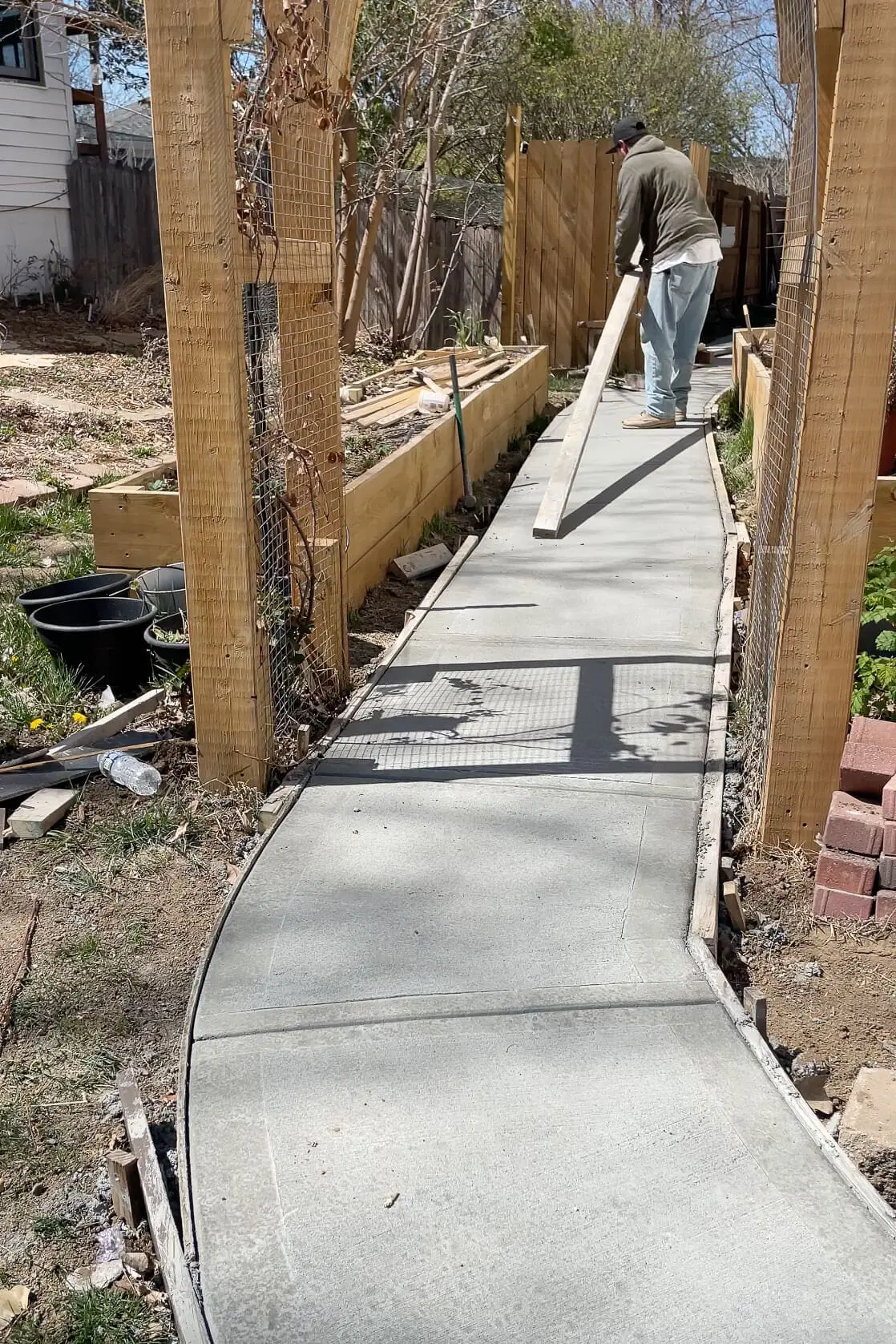 After the guys all went home for the day after setting the forms, I dug a trench and ran this piece of pvc pipe underneath. I had an awesome drip watering system that I put in for my veggie garden, and the waterline needed to get over to the other raised garden box. I really didn’t want a water line going across my concrete sidewalk, where it would just be a tripping hazard, so that meant it needed to go underneath.