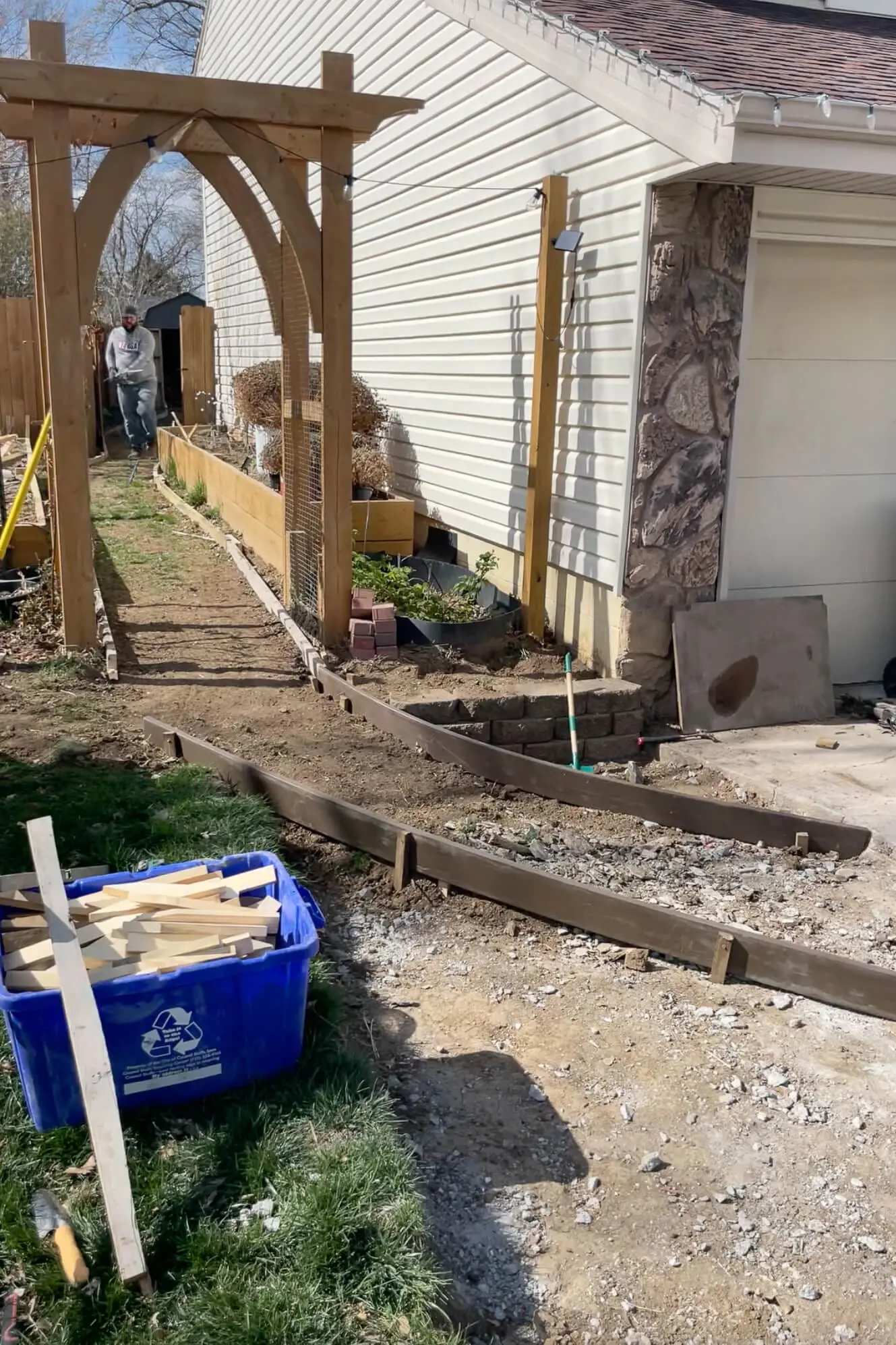 Before we could even start installing a sidewalk, they first had to remove this concrete pad. We needed somewhere to park our trailer, so in a knee-jerk decision, we had them put in a concrete pad right next to our driveway while they were doing our patio last summer. Afterward, I realized that I hated having the trailer there. It looked awful parked in front of my beautiful garden arbor, so it was time for the trailer to go somewhere else.