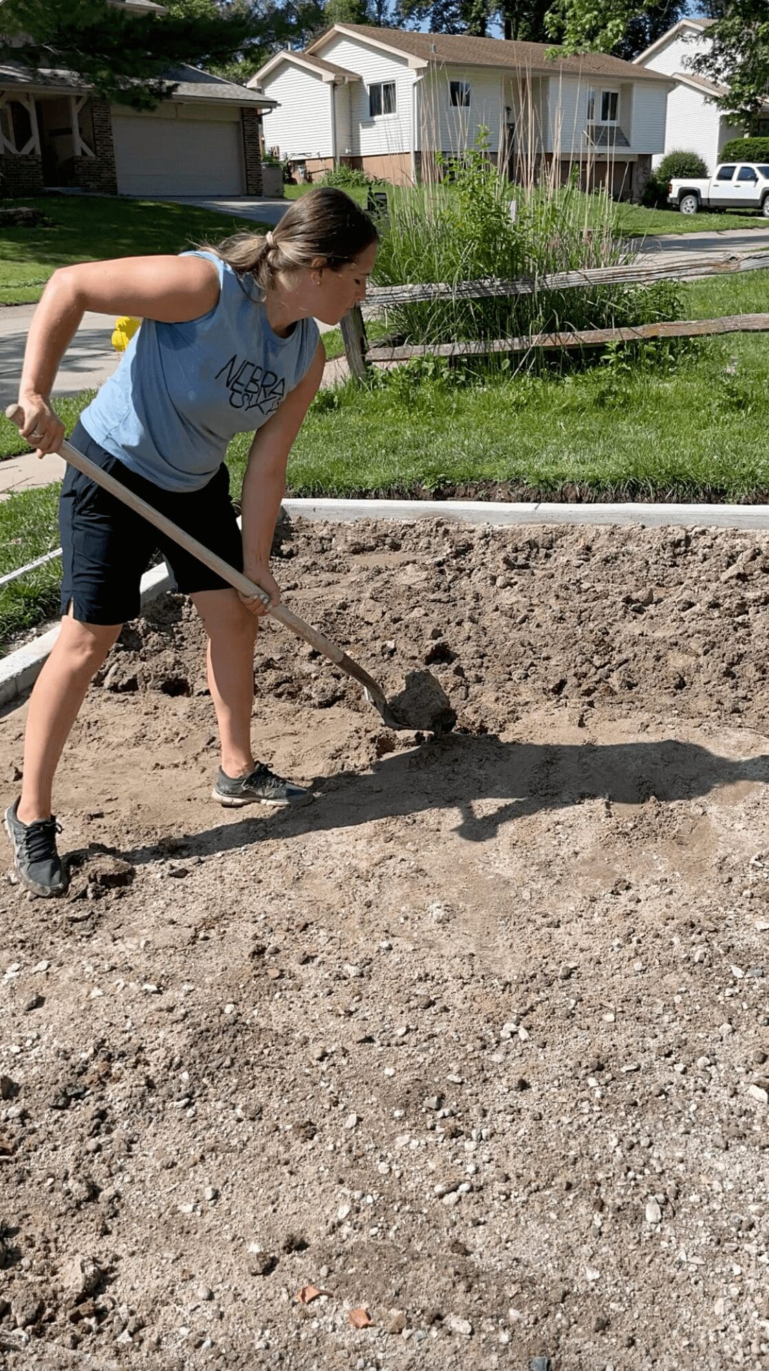 Once squared, we moved out all the extra dirt. I wanted my DIY paver patio to be level with the driveway, so I had to dig down. I used a tiller to break up the dirt, then raked and shoveled to get it out of the way.