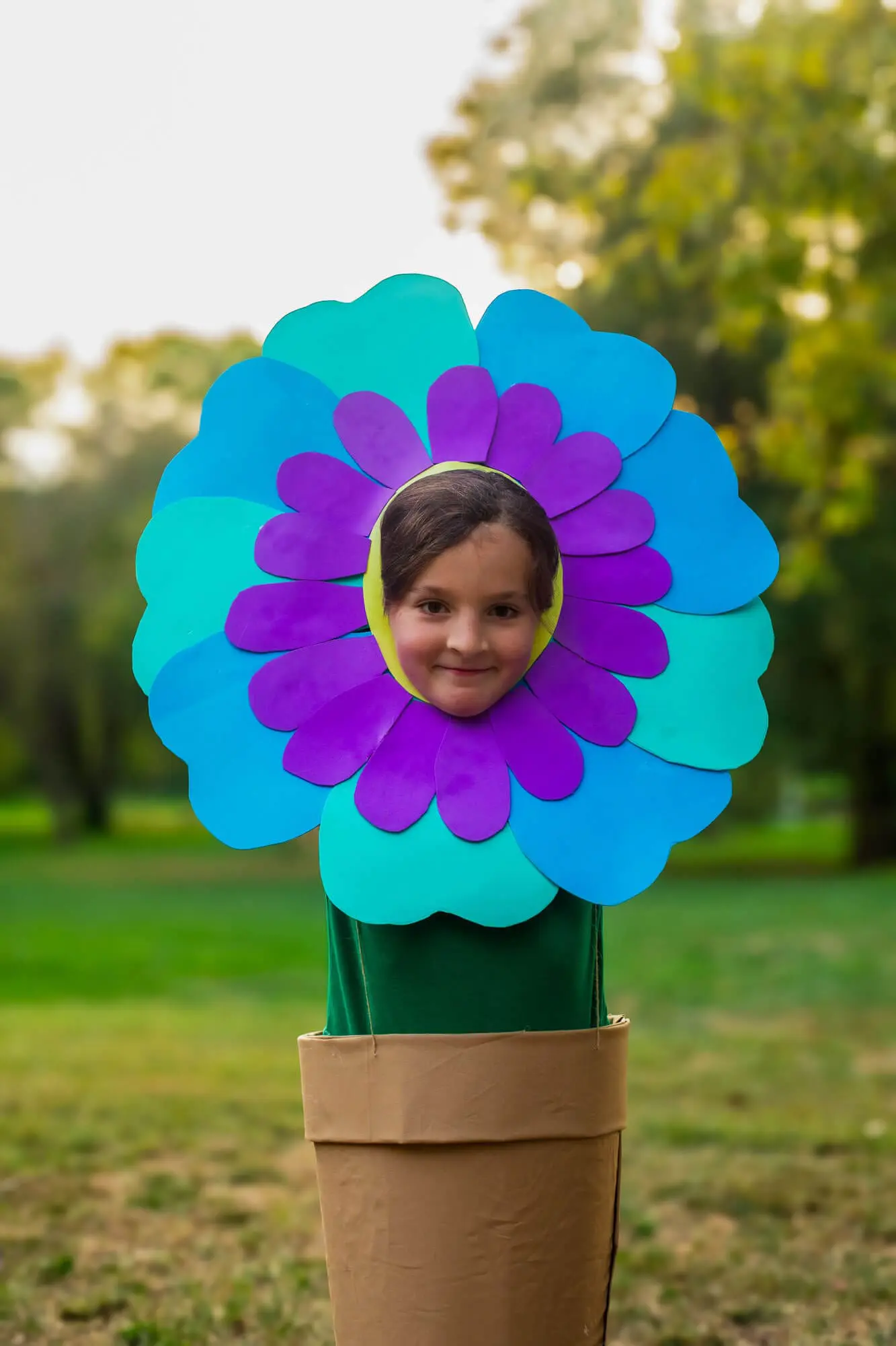 Cut cardstock petals (2–3 colors), glue them in a ring with a face opening, add a contrasting face rim, and pair with a poster-board “flower-pot” skirt wrapped in brown fabric. Green clothes = the stem.