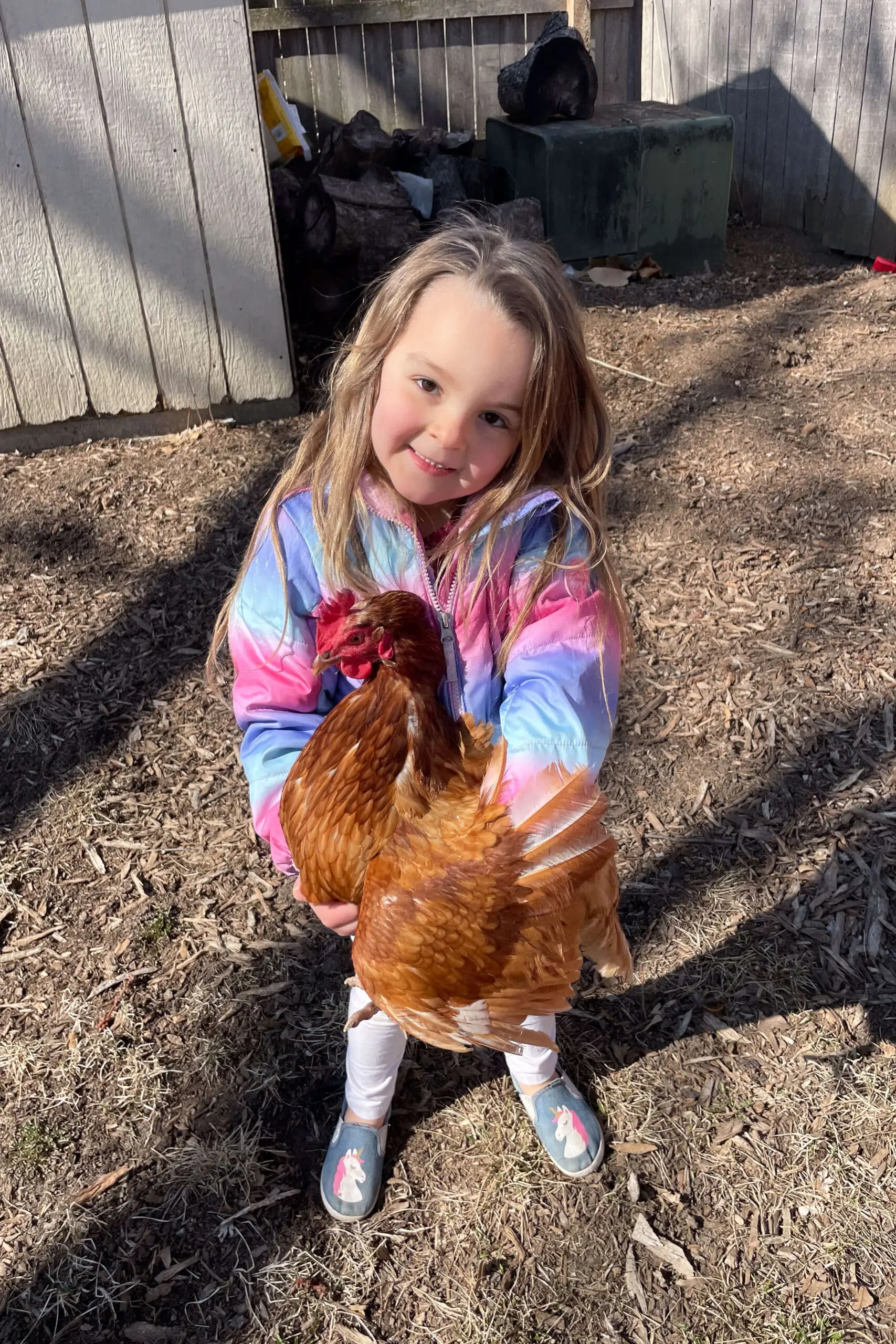These fly bags (see them hanging there on the side of the run?) are a must have for around your backyard chicken coop. Having backyard chickens, you’ll notice an increase in flies, but these bags really help keep the flies down so we can enjoy our backyard more.