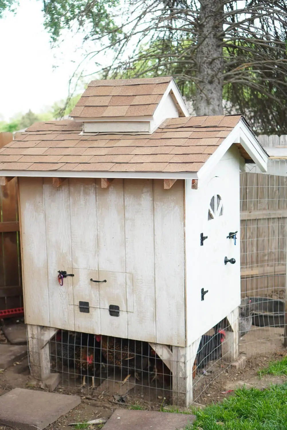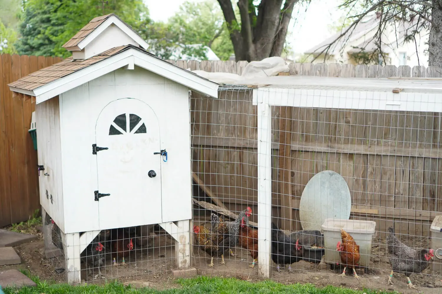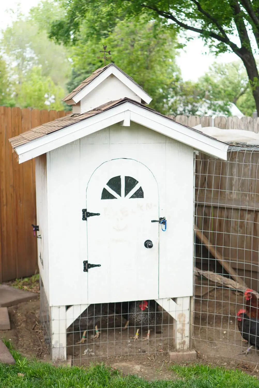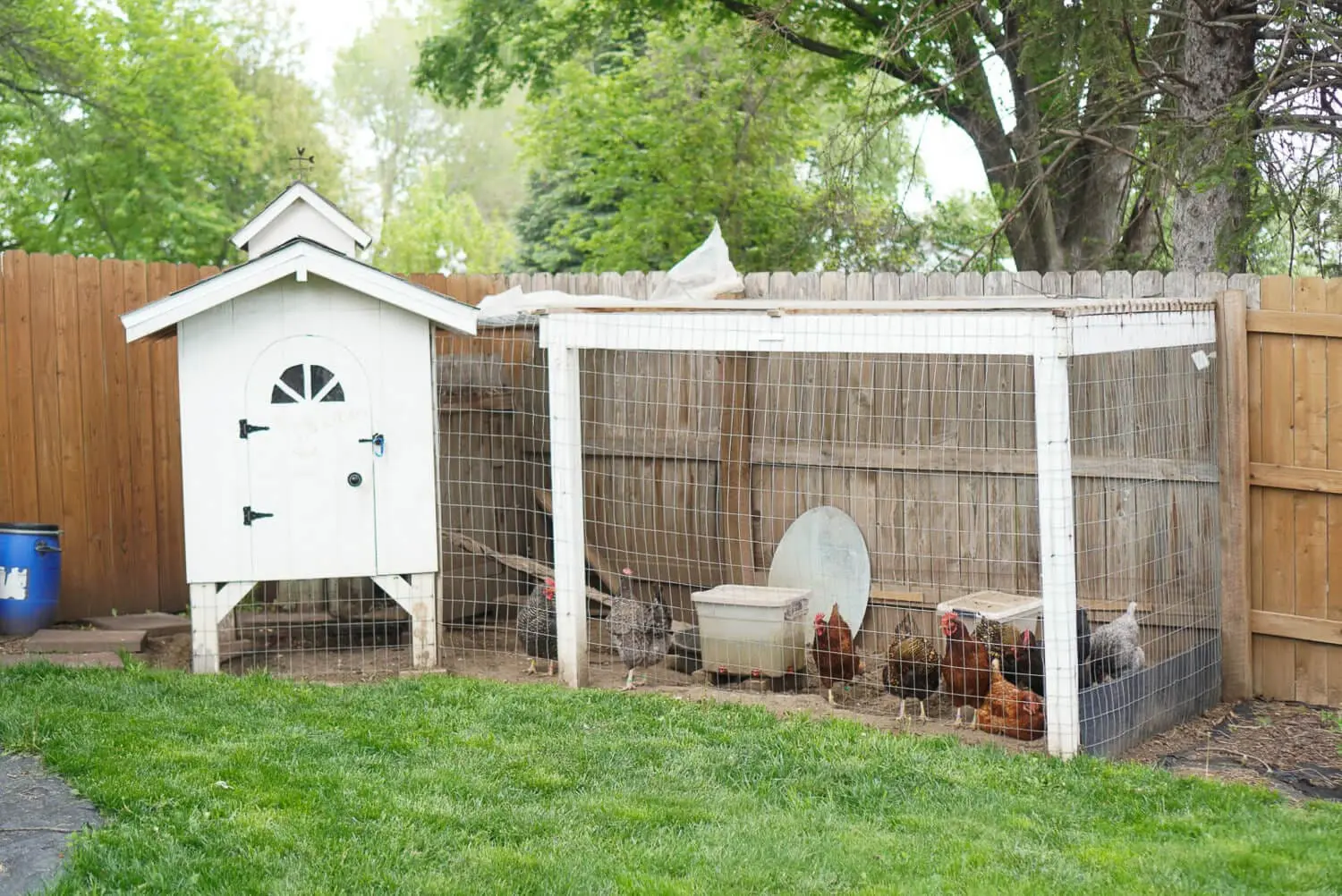 Right next to our low cost DIY chicken coop, we added a run. This is where the hens spend most of their day. We attached the run directly to the fence to save on some wood. We painted the run with the same paint and primer used on the coop, and enclosed it with welded wire fencing.