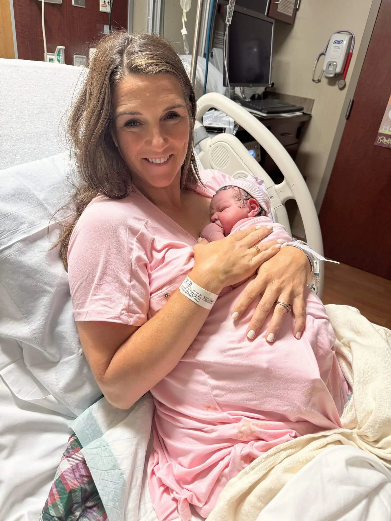 Once we got to the hospital, the contractions weren’t speeding up, but they were definitely getting more intense. I got checked and was at 5 cm dilated and 70% effaced. I got the epidural—and thank goodness—because by that point, things were really starting to hurt.