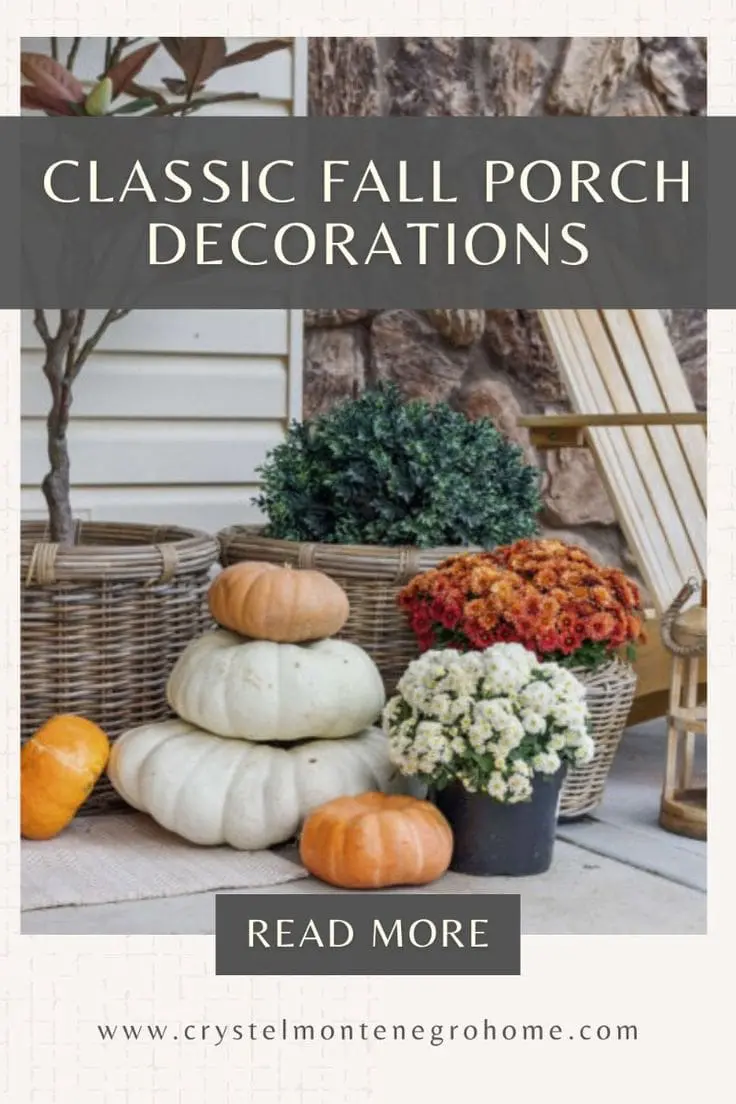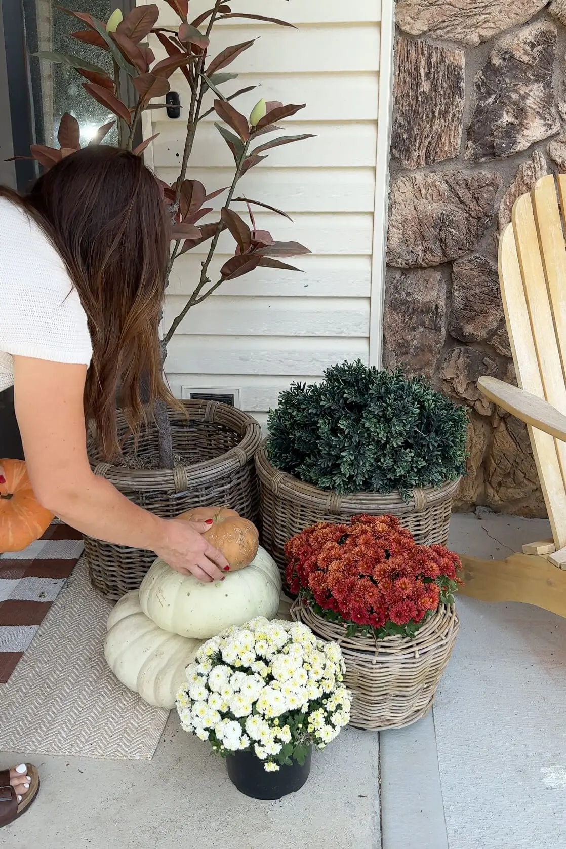 Baskets are another favorite of mine for fall front porch decor. They’re so versatile and easy to change with the seasons. I used a large basket for a magnolia tree and a smaller one for some mums. I like keeping things neutral with pops of classic fall colors, and even the black nursery pots blend in when I don’t have decorative baskets handy.
