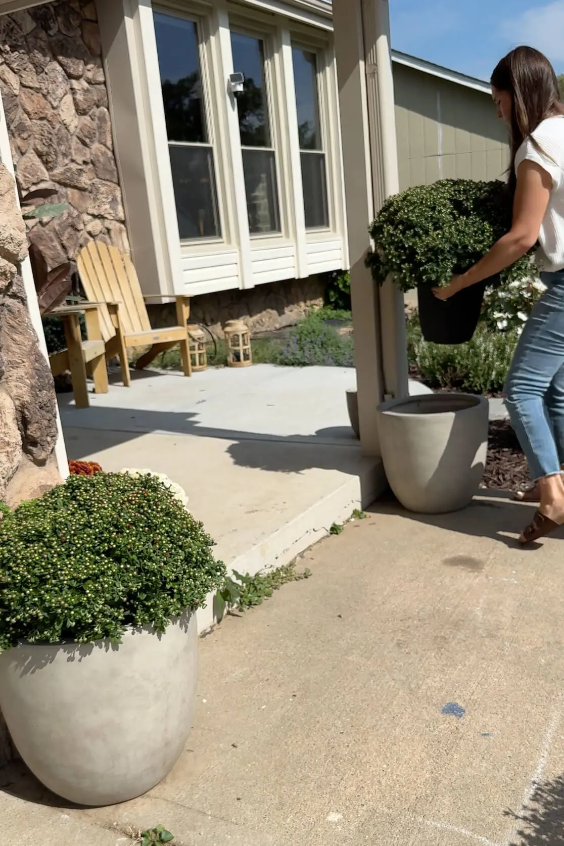 These concrete planters are perfect year-round! Over the summer, I used the taller versions with topiaries, but now I’ve switched to the shorter ones to complement my mums. Mixing different sizes adds some variety and visual interest.