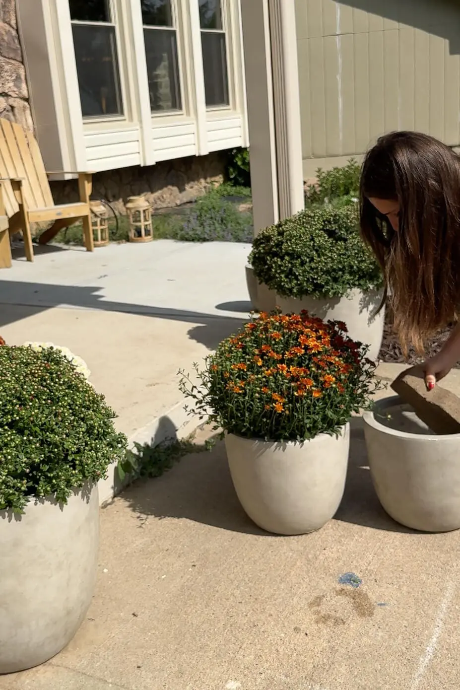 Pro tip: My planters were too tall for the mums, so I got creative and propped the plants up with some leftover bricks from our paver driveway expansion!