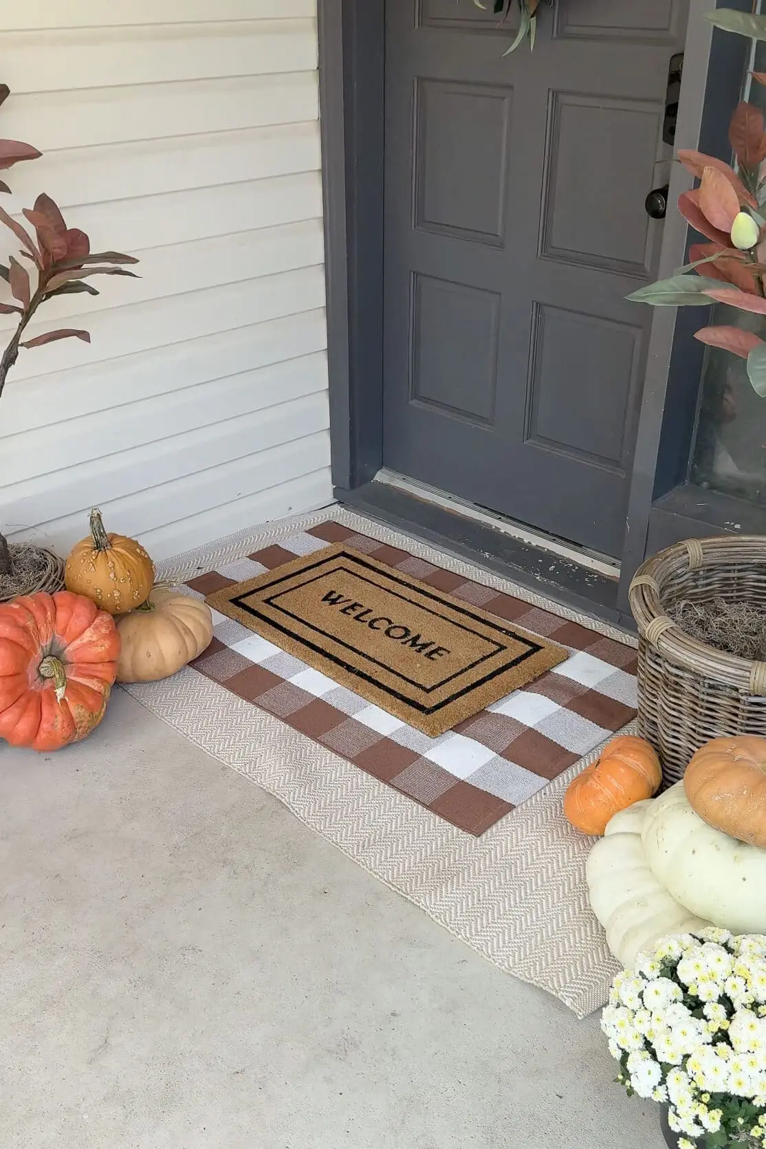 Layered doormats are a must for my fall front porch decor. This year, I went big and used three! First, I laid down a linen-colored herringbone rug, topped it with a buffalo check mat (the ultimate fall neutral), and finished with a classic welcome mat that ties it all together with timeless style.