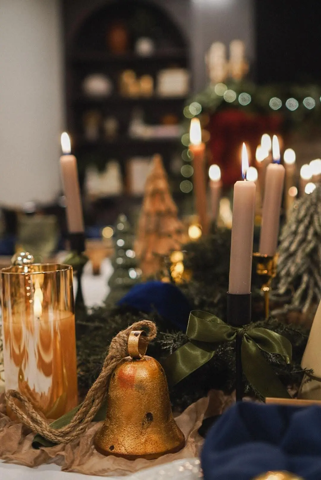 Once you’ve laid your greenery, it’s time to add candles. Candles bring warmth and ambiance, instantly giving your table a luxurious feel. They add shape, color, and texture to your centerpiece, making your tablescape look more dynamic.