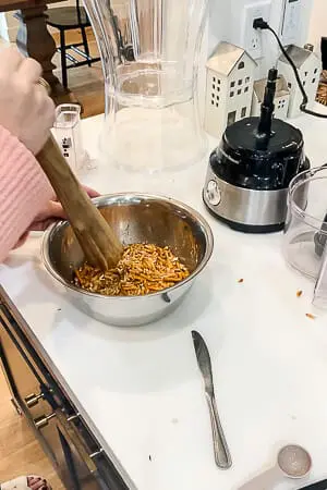 In a medium bowl, mix the crust ingredients. I used my food processor to crush the pretzels and then my kimchi pounder to combine everything.