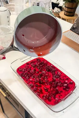 In a medium saucepan, dissolve the raspberry gelatin in boiling water. Set aside to cool to room temperature.