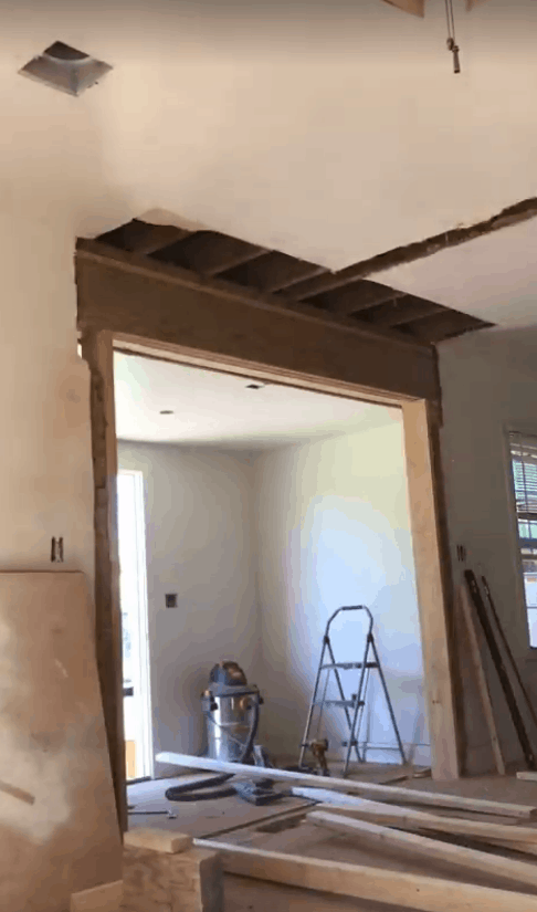 This is looking into the main living area from the newly built popout. Just behind this middle column there is a wall separating the left side of the room from the right side of the room.