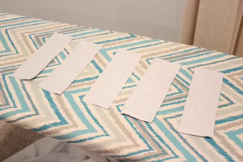 Next you’ll want to cut your tabs. I used some of the extra fabric but they’ll mostly be hidden so you can use whatever you’ve got. I cut these about 2 inches wide and 7 inches long, but I wasn’t precise about the measurement because they won’t be seen. I only cut 5 strips but it probably would have been a little better if I made 6.