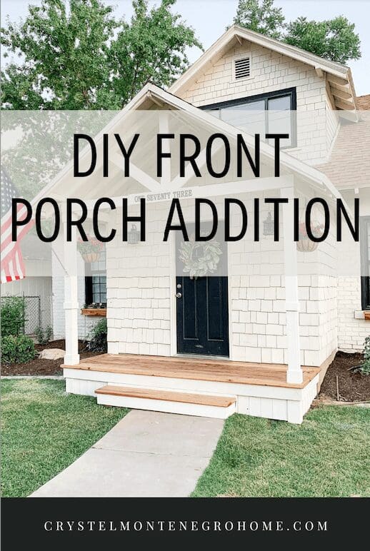 I built this DIY white front porch to boost our curb appeal, create a shady place to sit, and keep an eye on my kids while they play outside. And let’s be honest – it’s a lot cuter than sitting under an umbrella.