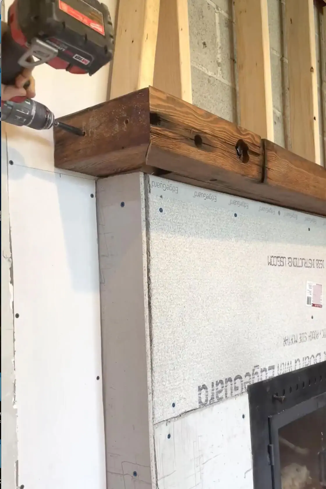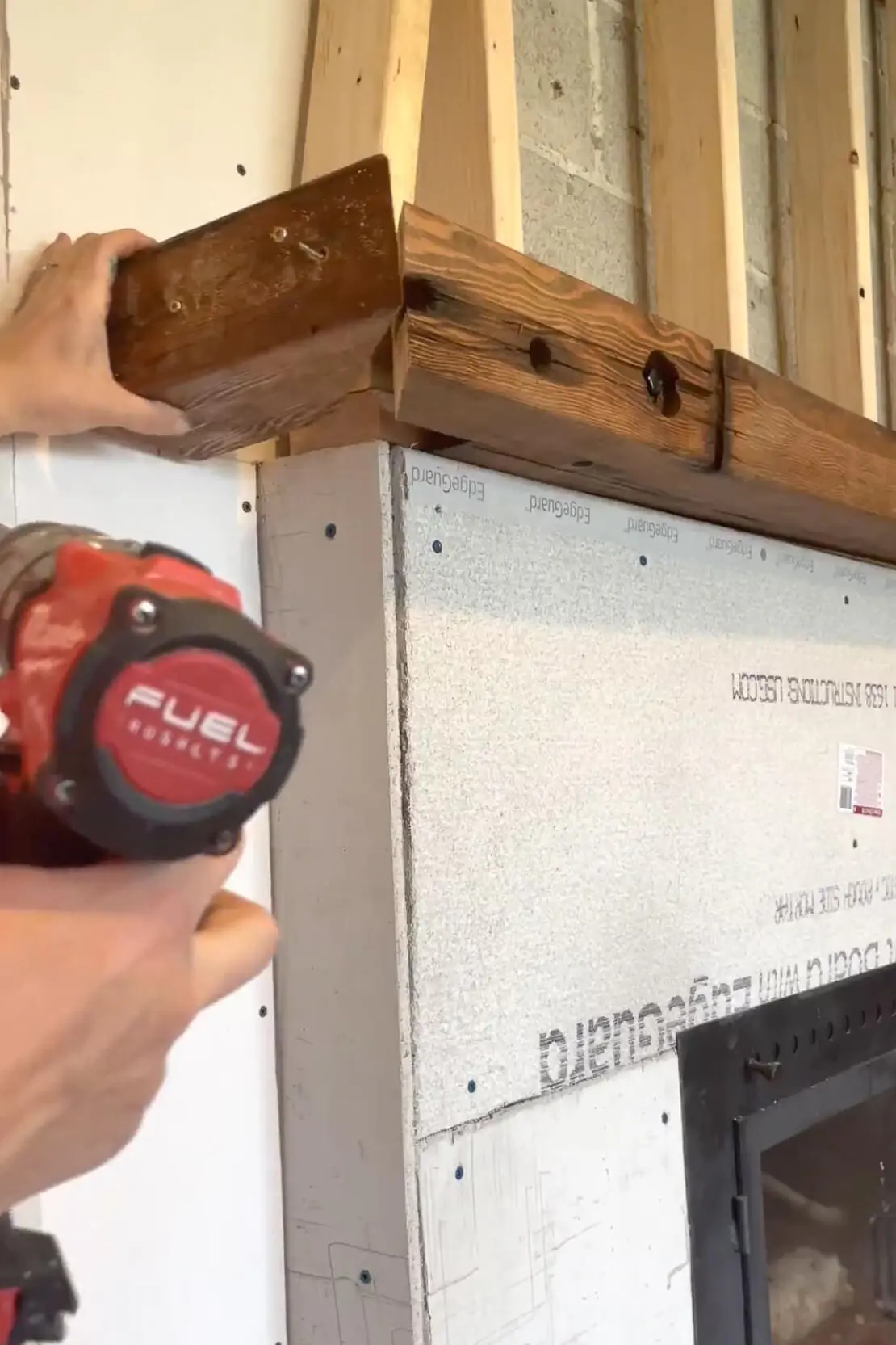 A vertical 2×4 under the mantle acted as an extra hand during installation. Using a socket and socket adapter for my drill, I set the lag screws with washers into the pre-drilled holes, attaching the mantle to the fireplace framing.
