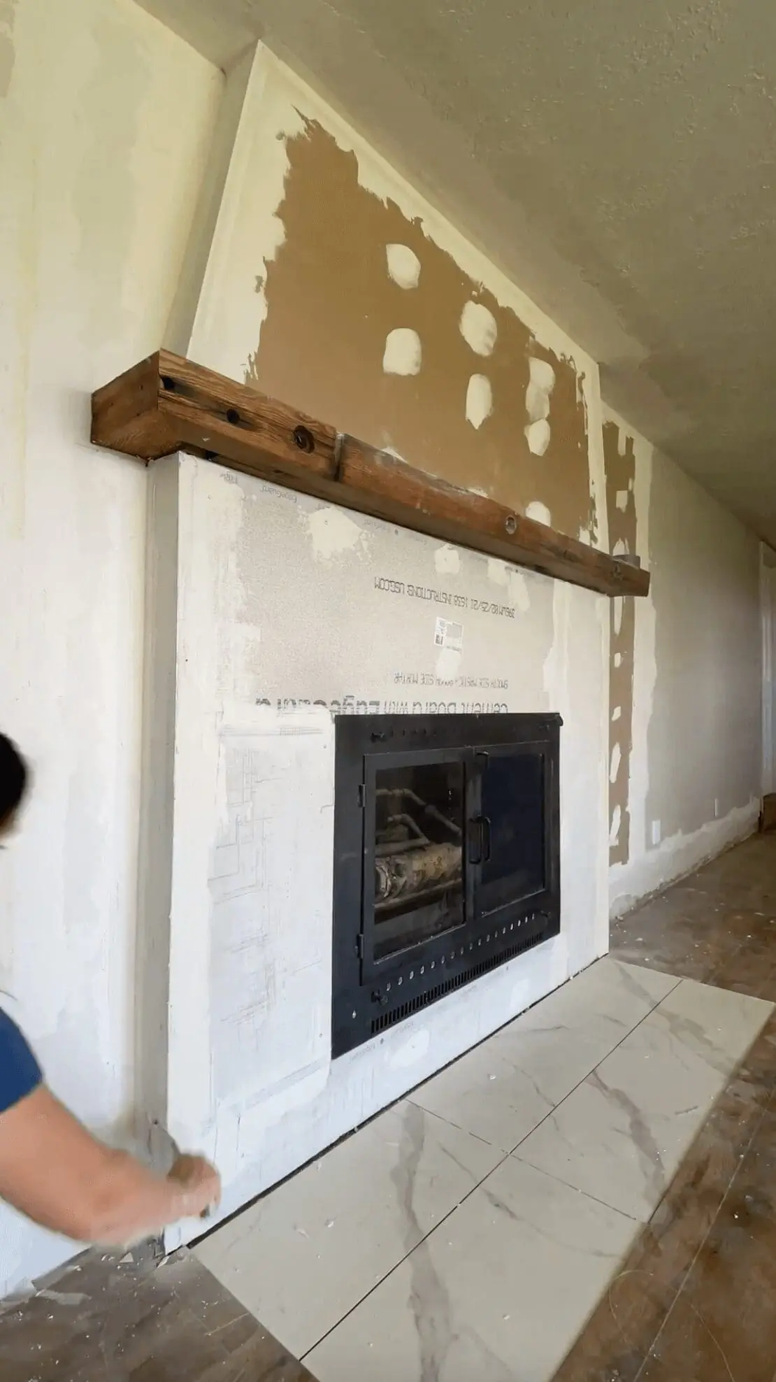 Use metal corner beads and noncombustible mesh tape for cement boards around the insert. I used leftover thinset from our tile floor to cover seams and corner bead.