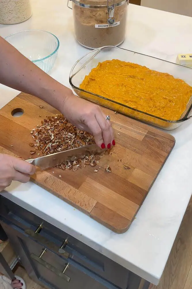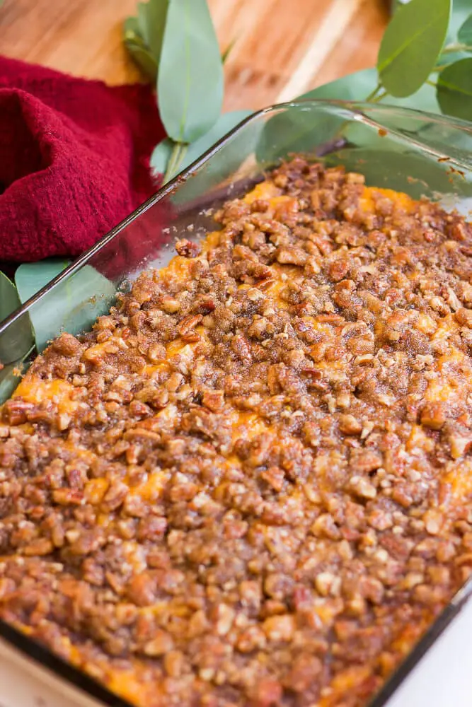 Prepare Topping:In a separate bowl, mix together the brown sugar, melted butter, and chopped nuts until crumbly.Sprinkle this mixture evenly over the sweet potato layer.