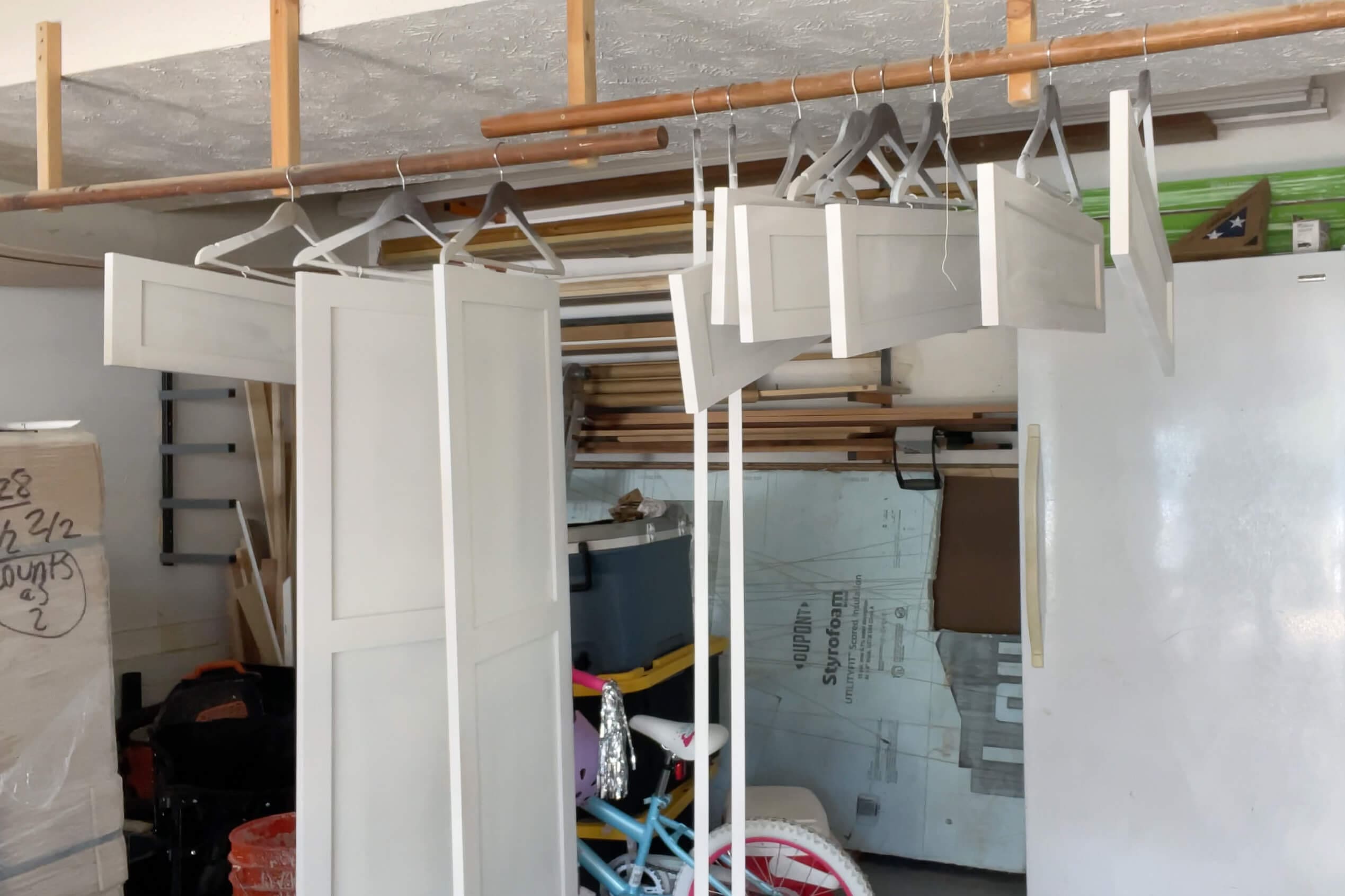 Painting cabinet doors and drawer fronts used to be a nightmare. I tried those little plastic cones to prop them up, painting one side, waiting for it to dry, then flipping it to do the other. Talk about a time suck! Then, I discovered the hanging method. No more flipping them over or waiting for one side to dry!