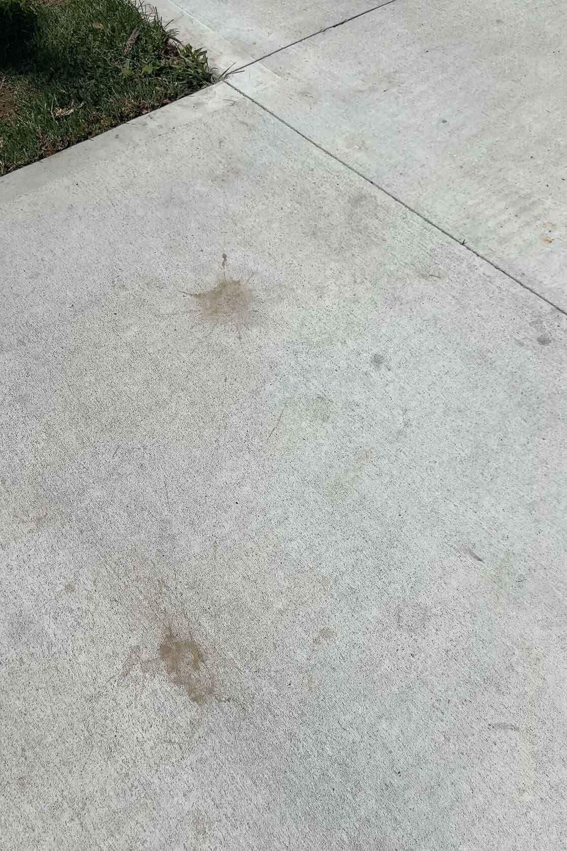 These photos are after the pressure washing. Yuck! I knew I was going to have to get creative to get these stubborn stains cleaned off my concrete patio.