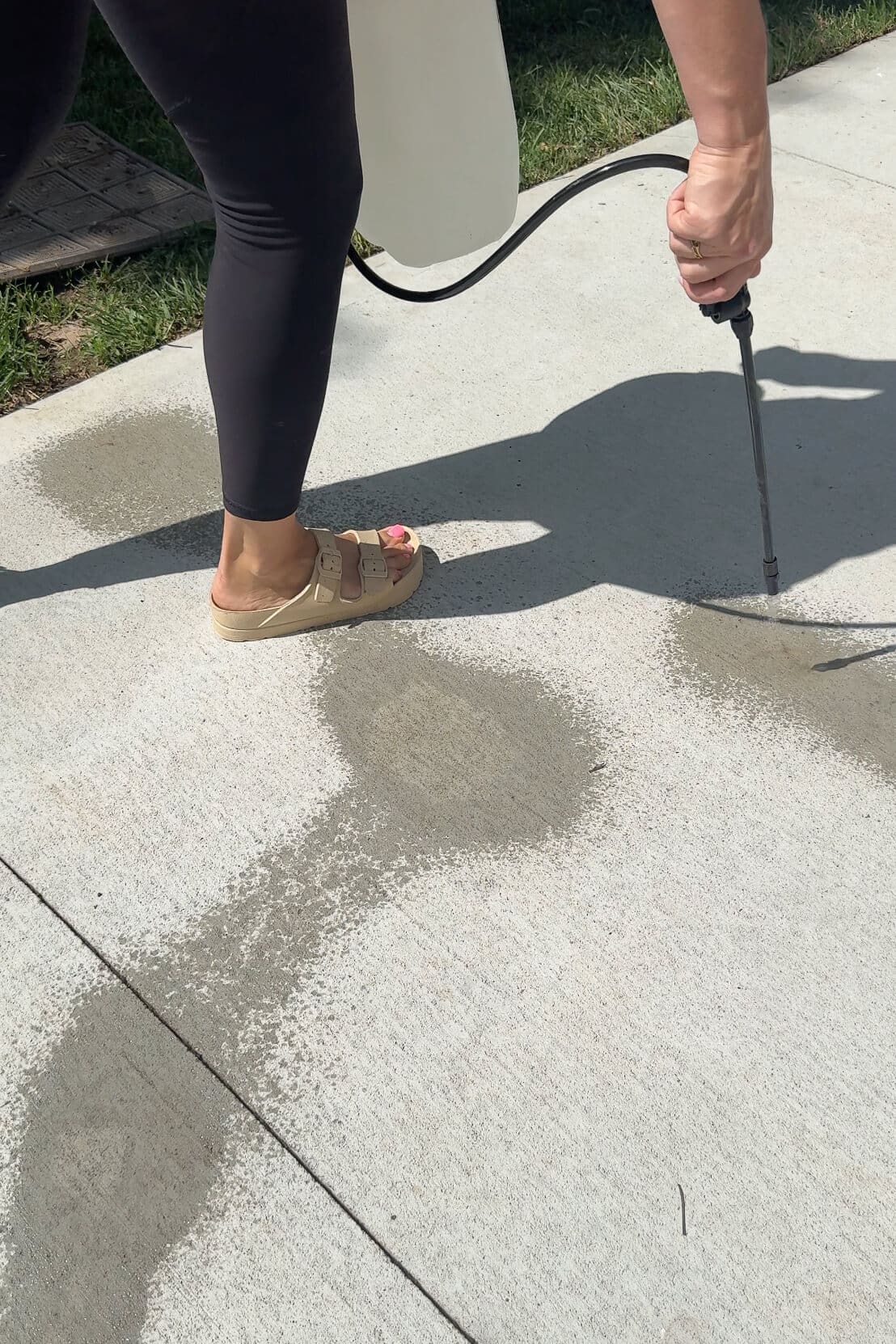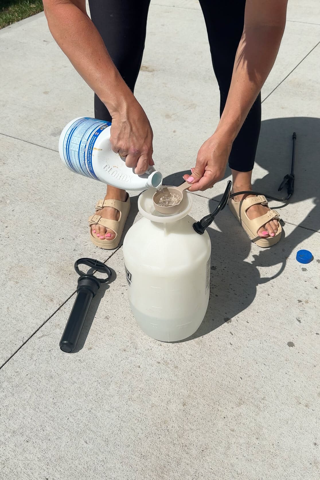 Naturally, I went with the conventional wisdom that I found recommended on the internet. I mixed up a solution in my pump sprayer: five parts water to one part bleach. I sprayed it directly on the worst spots, let it sit for 5 to 10 minutes, gave it a solid scrub with the push broom, then rinsed it off with the pressure washer again.