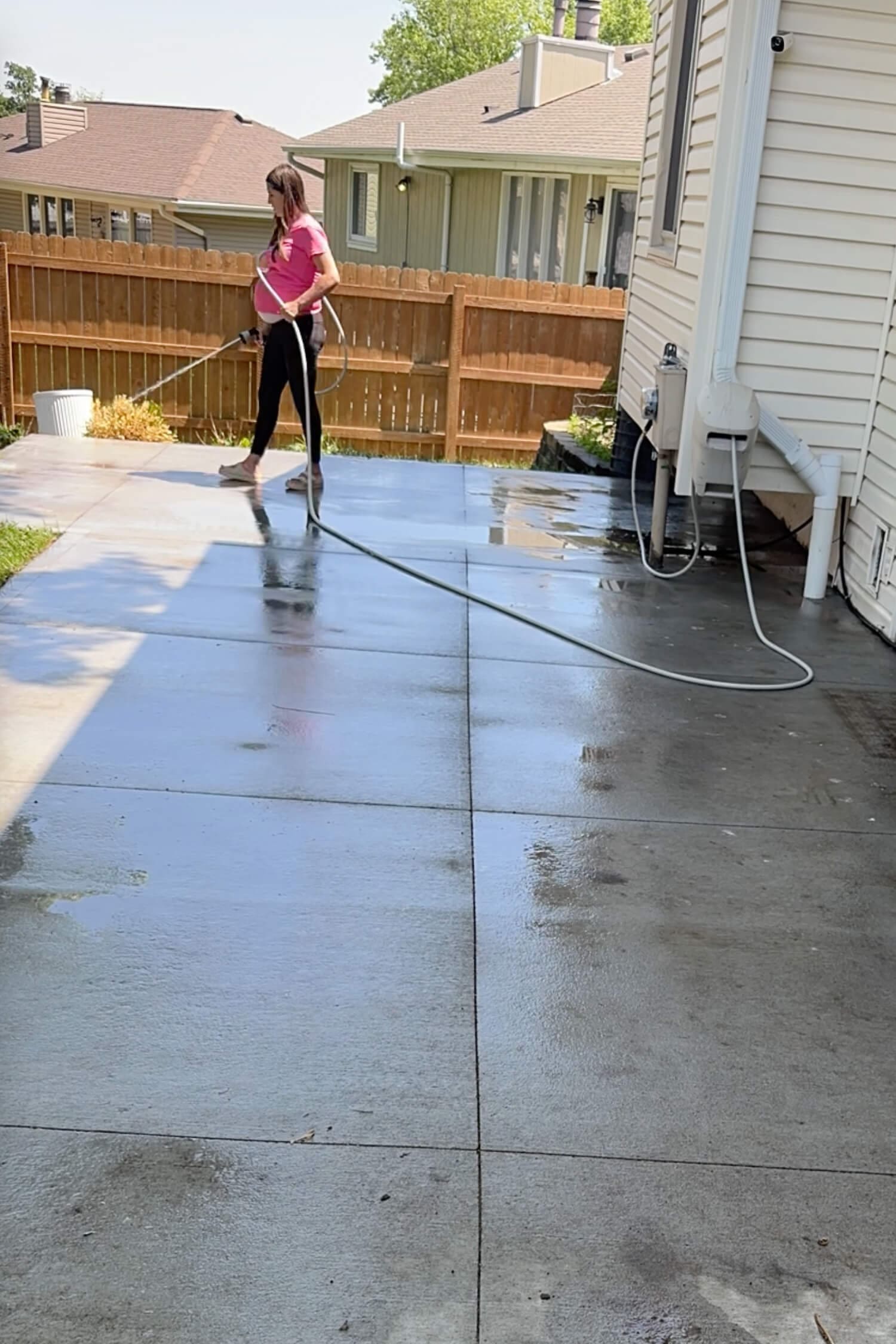 Woman pressure washing a backyard patio, cleaning dark buildup off the concrete surface
