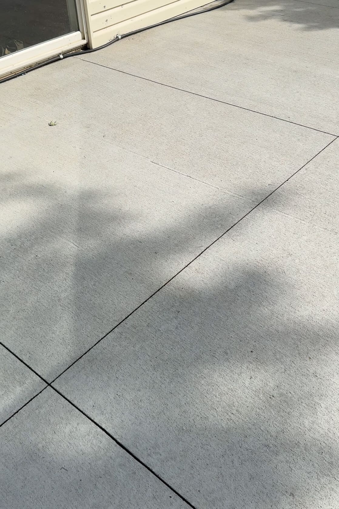 Clean concrete patio near house siding and sliding glass door, with deep shadow lines and visible control joints