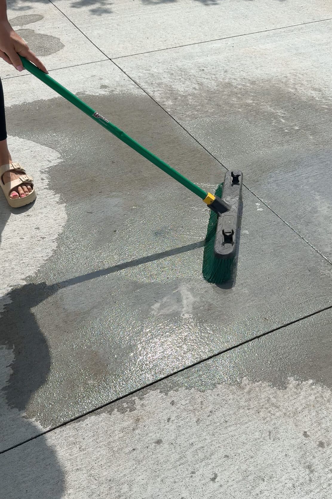 Grab your push broom and scrub thoroughly. I mean really work that concrete cleaner into the surface.