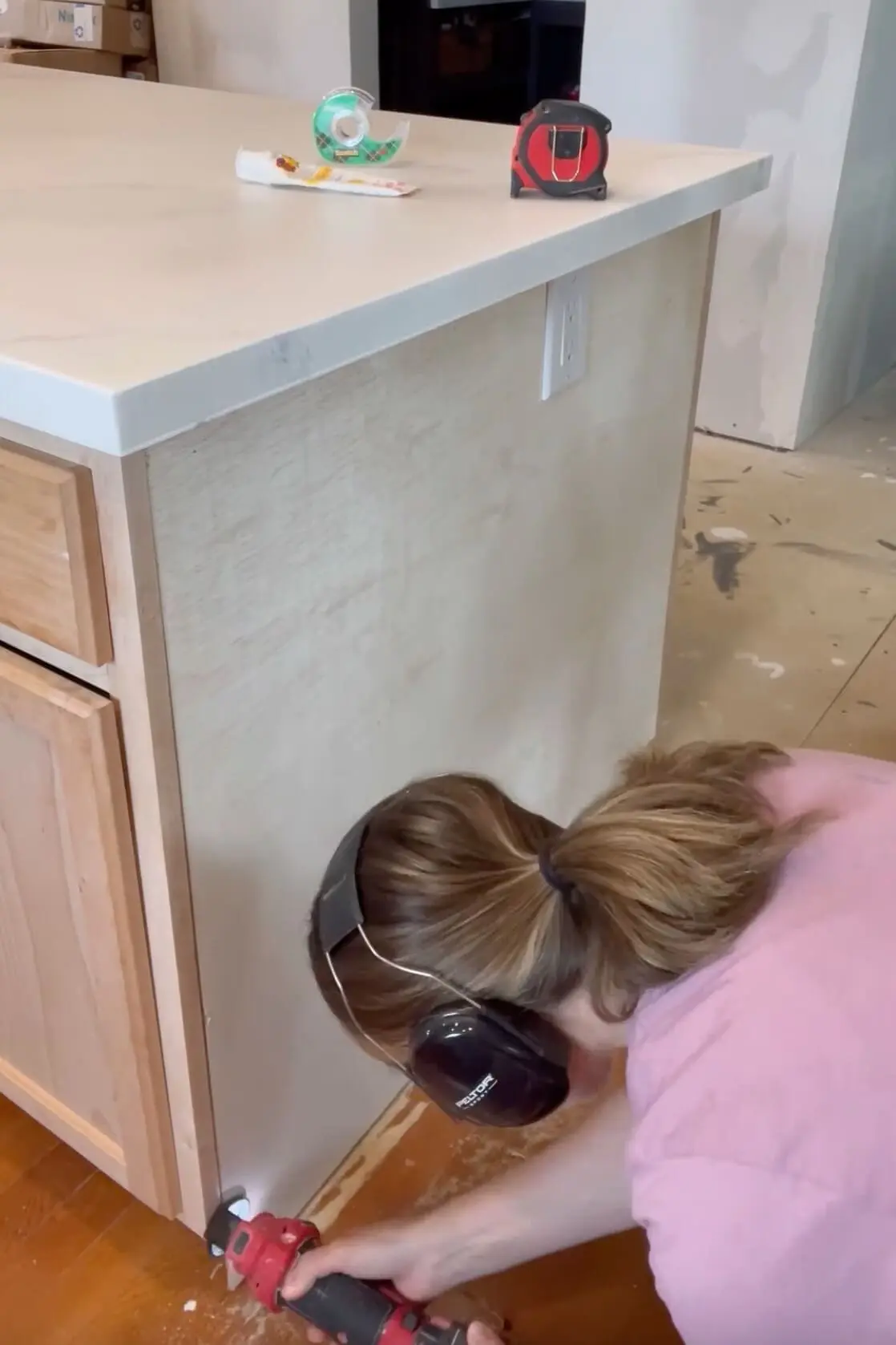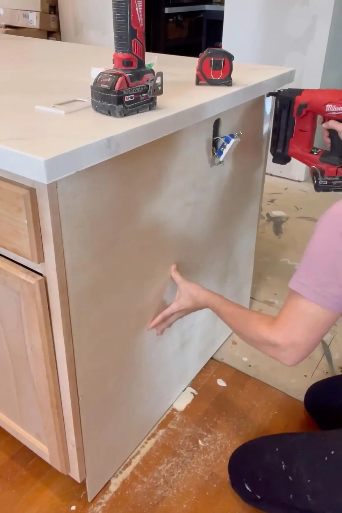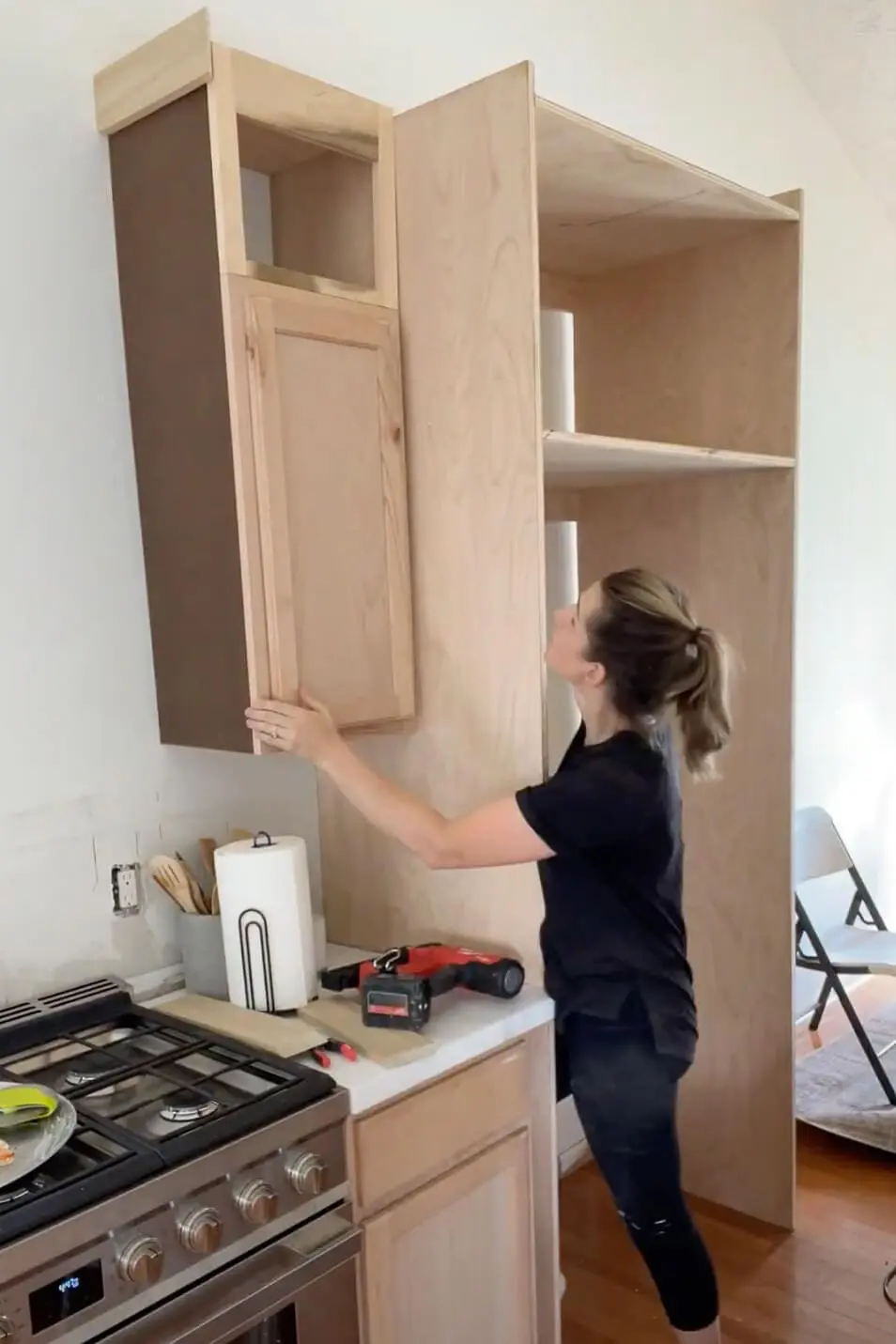 Another key DIY step with unfinished cabinets is adding filler pieces. If your kitchen layout doesn’t match your current cabinet sizes exactly, you’ll need to fill in the gaps. I used 1/2-inch plywood, clamped it in place, and screwed it in from both sides. A quick tip: just be sure to drill a pilot hole first to avoid splitting the wood!