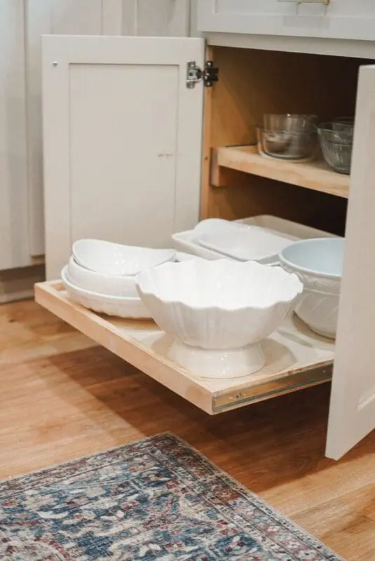 The shelving in stock cabinets isn’t great. Custom cabinets usually have fancy features like pull-out shelves. Adding drawer slides and building your pull-out shelves is an easy upgrade. It maximized my storage and gave the cabinets a custom feel. You can find the instructions for those pull out drawers and shelves here.