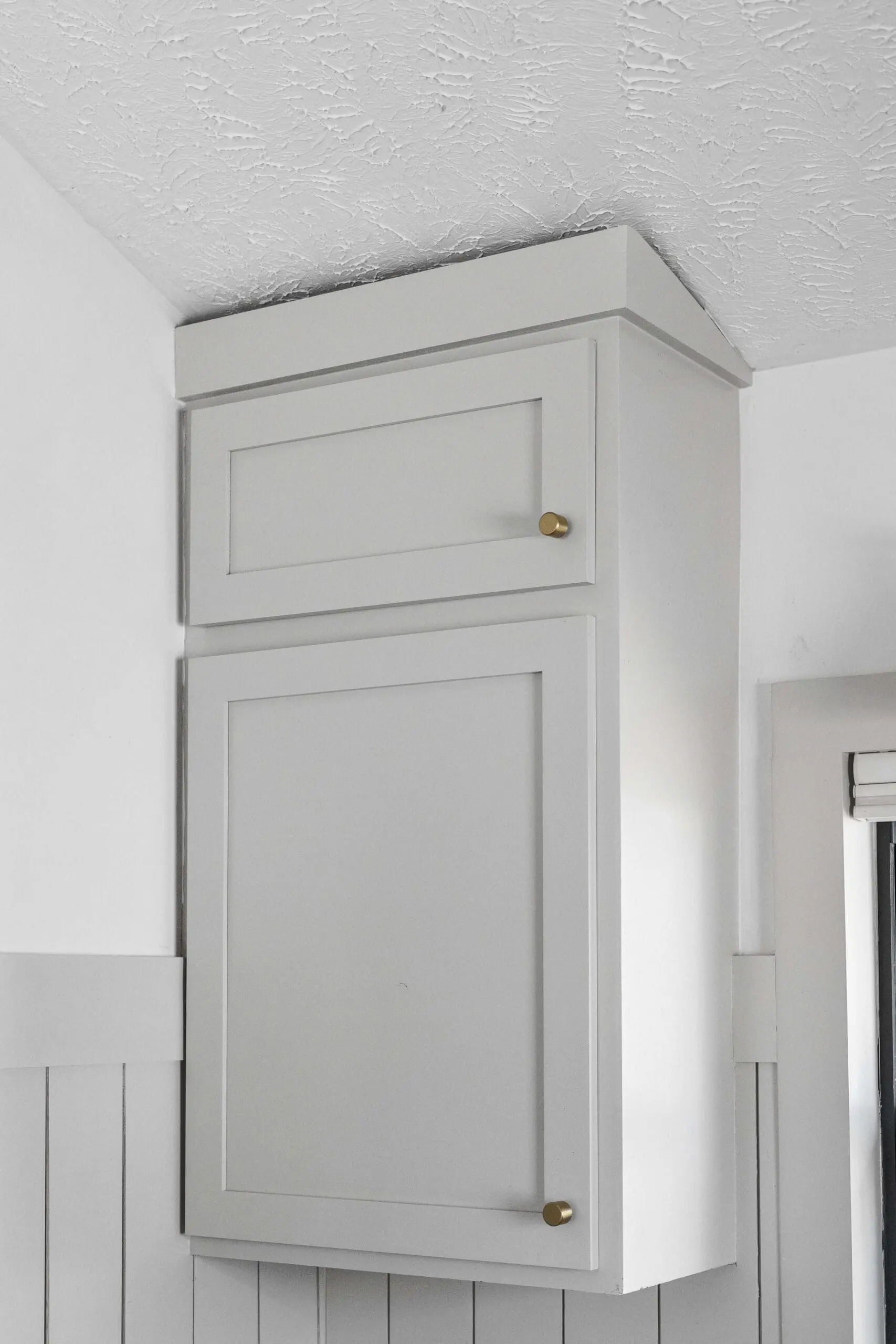 I love our tall ceilings, but the space above the cabinets was wasted. So, I built mini cabinets on top of the stock ones, adding extra storage and giving them a custom look. Adding trim around the tops took things to the next level, making these cabinets feel high-end. I have a full post showing you how I built the extension cabinets and added the crown written for you here.