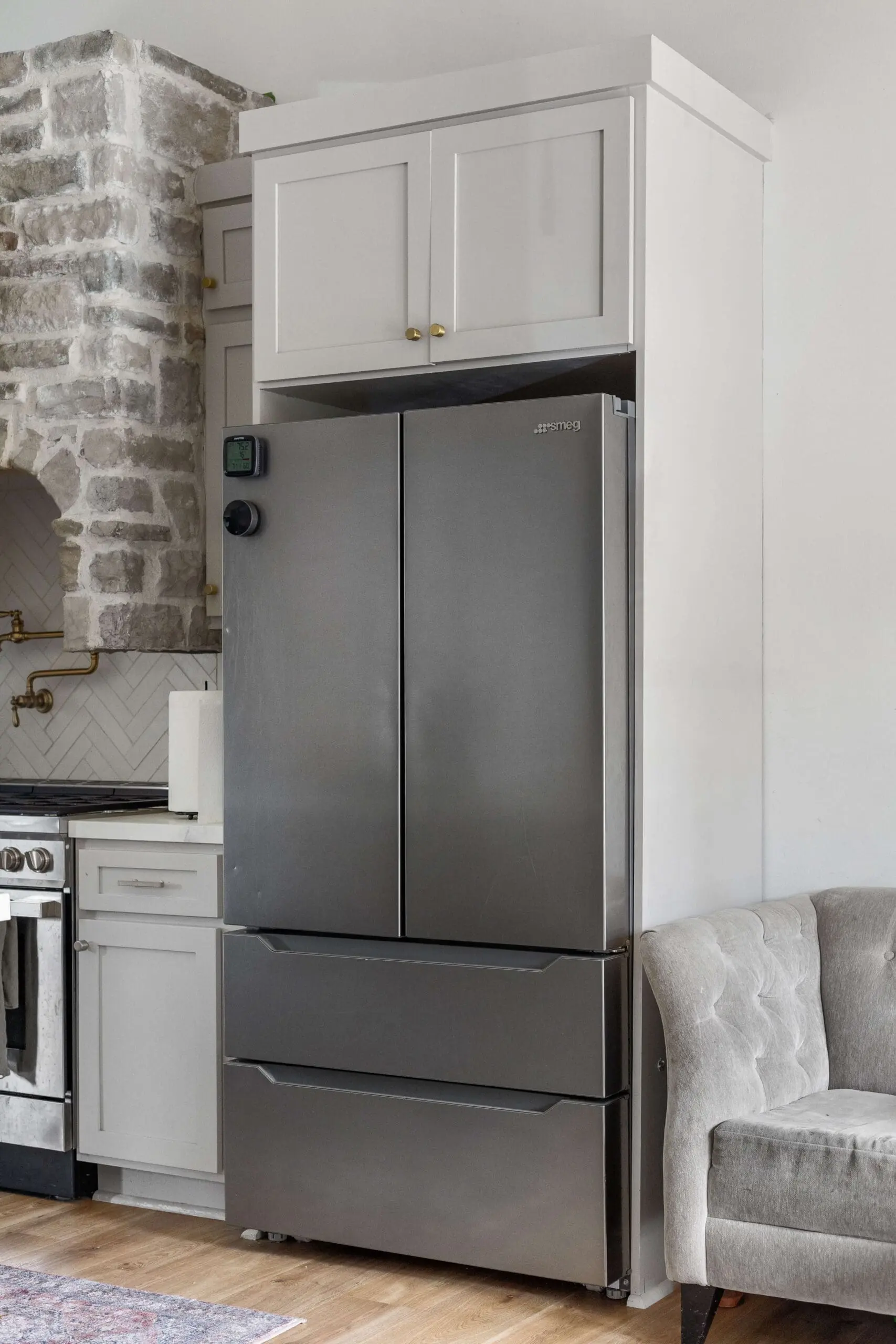 Another thing to note about unfinished kitchen cabinets is that they don’t come with all the bells and whistles. Refrigerator cabinets? Not even a thing. Enclosing the fridge in a cabinet looks amazing, and bonus points for extra storage. I have all the details in a blog post for the step-by-step tutorial on building a refrigerator cabinet.