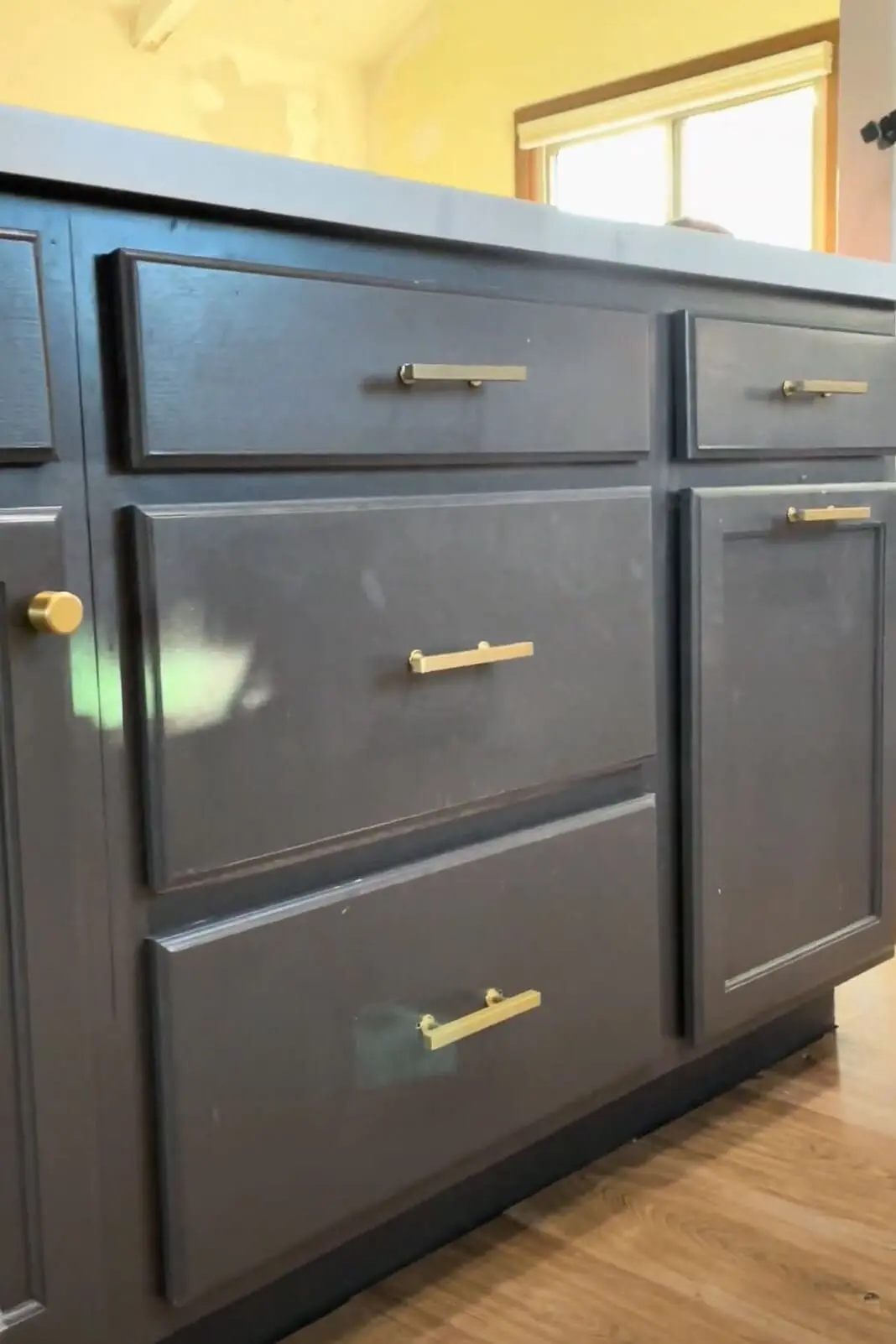 High-end cabinets usually come with finished end panels, and let me tell you, they make a difference! The fronts of my unfinished kitchen cabinets are made from nice wood that’s ready for paint, but the sides are just exposed particle board. If the edges are tucked away against a wall or an appliance, it’s no problem. But if they’re out in the open, like on my island, you’ll want to cover the sides using 1/4-inch plywood and attaching it with a brad nailer. Once painted, they blended perfectly with the rest of the cabinets.