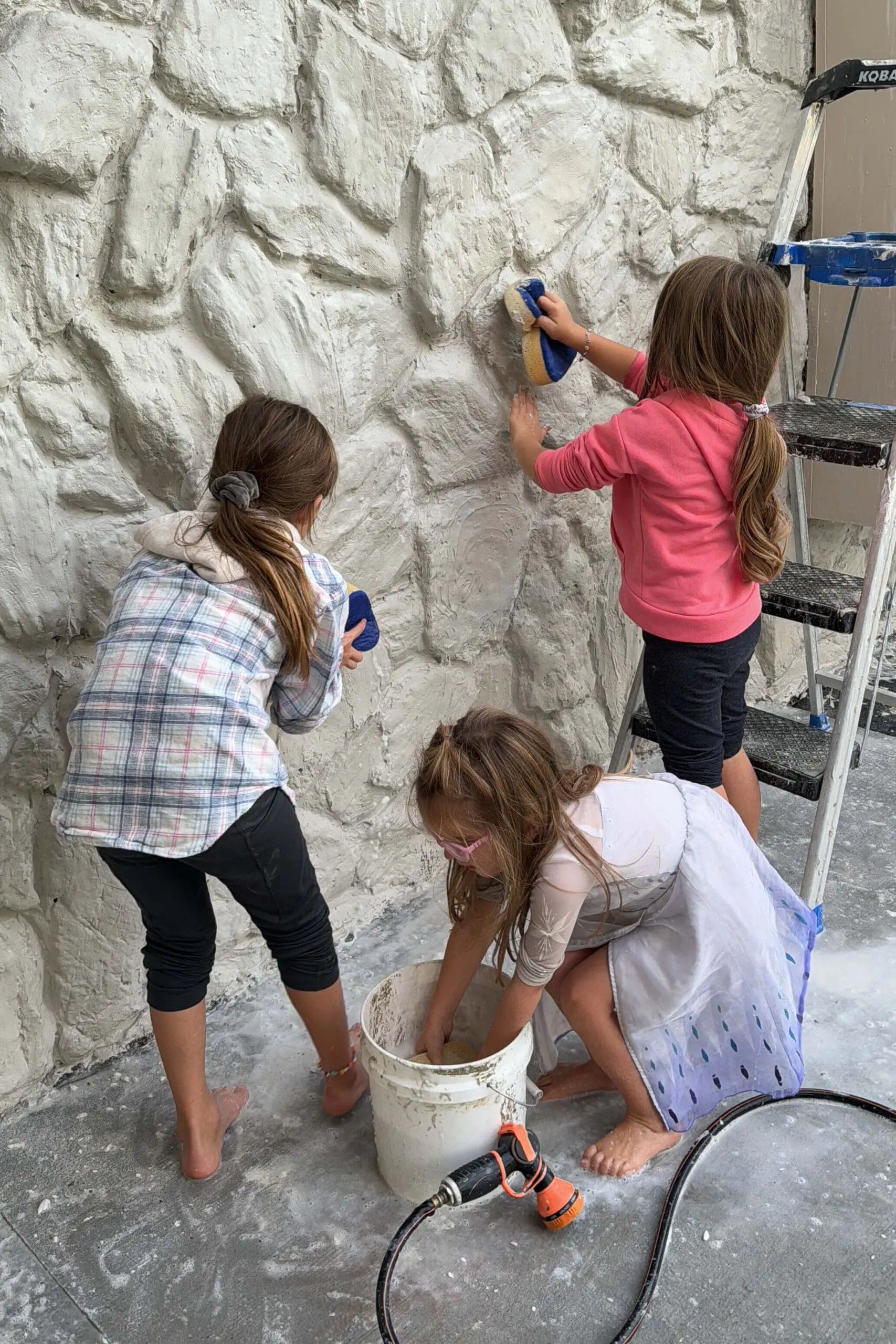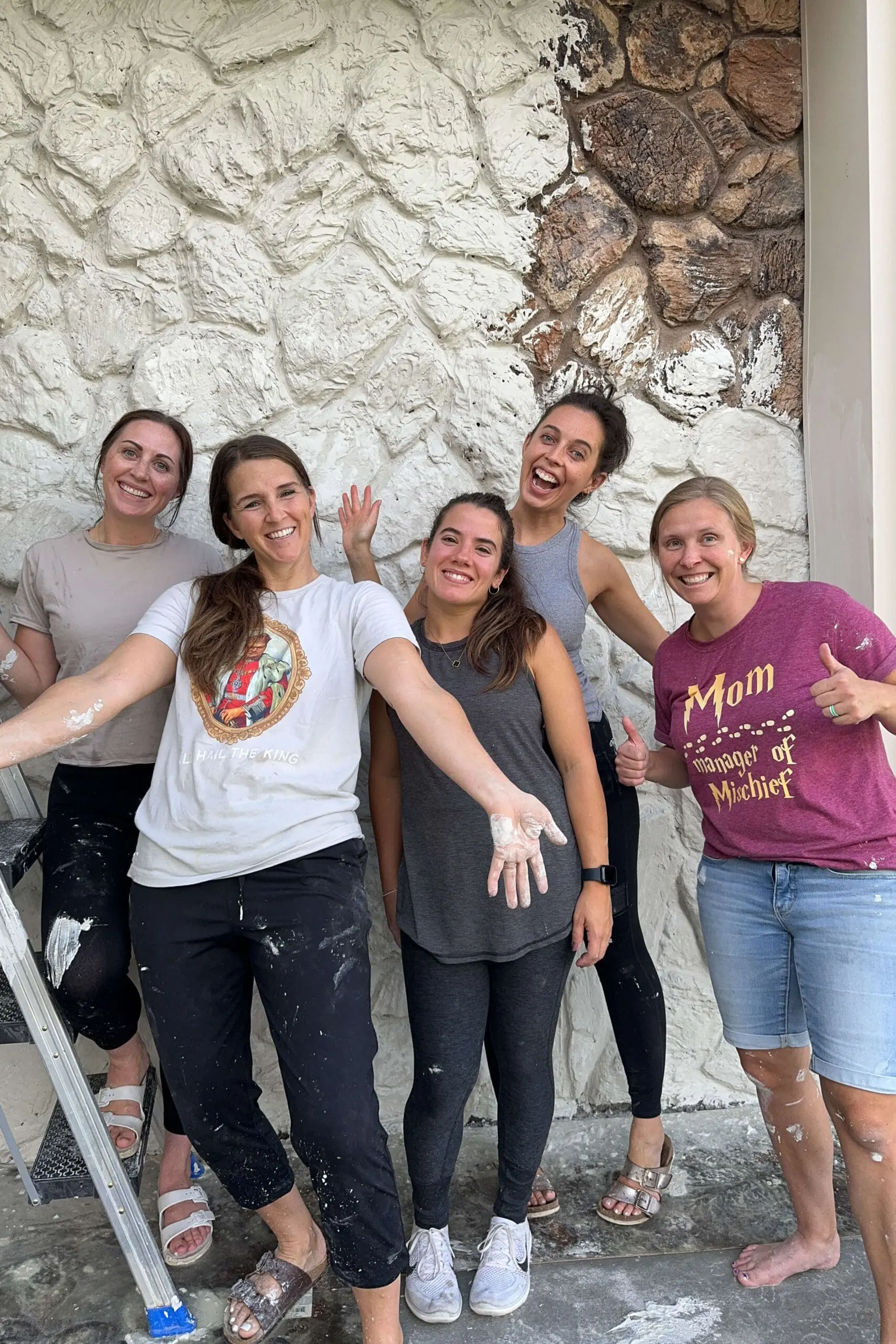 I had large sections of exterior rock siding around the patio, dining room windows, and both sides of the garage. Since it was such a big project, I called in some reinforcements, and I’m so thankful a group of friends came over to help for the day. Many hands really do make light work! This is a fun project to tackle with a group.