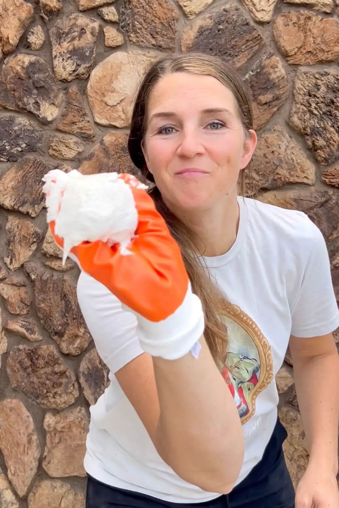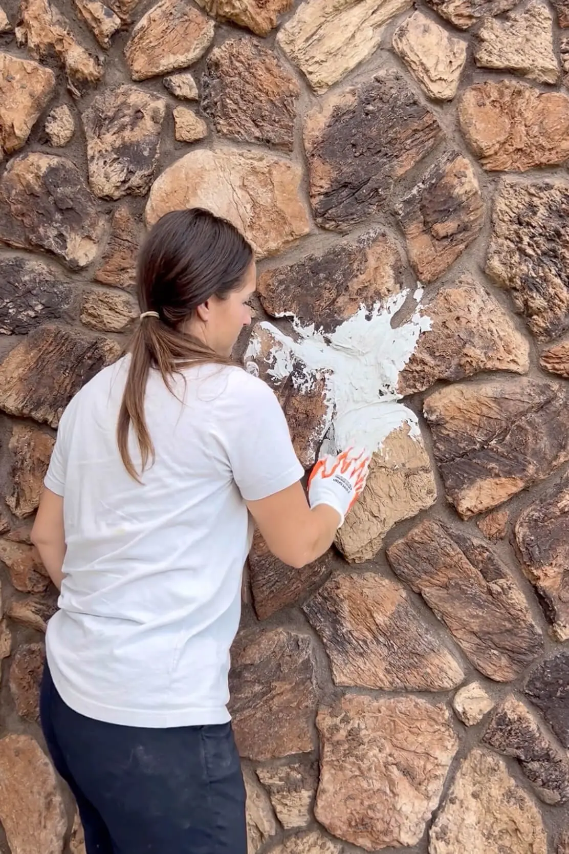Put on gloves, grab a handful of mortar, and start spreading. My goal was to keep some of the stone’s texture but fill in the deep gaps between the rocks and smooth out the rough 1970s lava rock appearance.